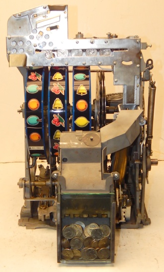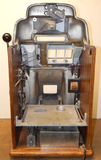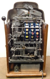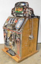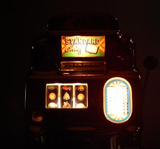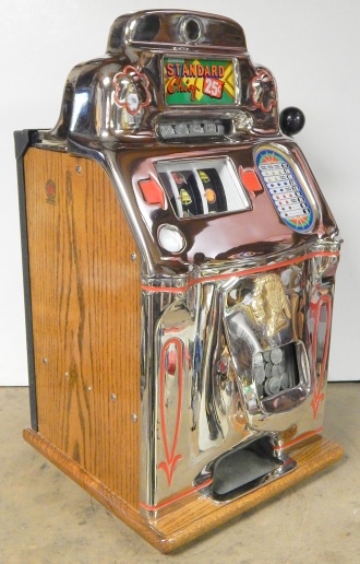 1947 Jennings "Chrome" Standard Chief 25 cent "Light-Up", a very nice previously restored machine. The chrome plating on this machine is a 10 out of 10, just beautiful. New reel strips, New Cashbox, original back door with ace lock. Very nice oak cabinet. Plays very nice.