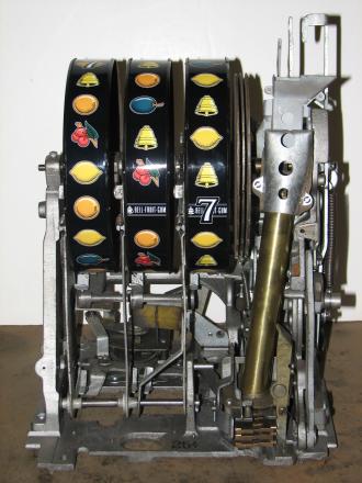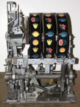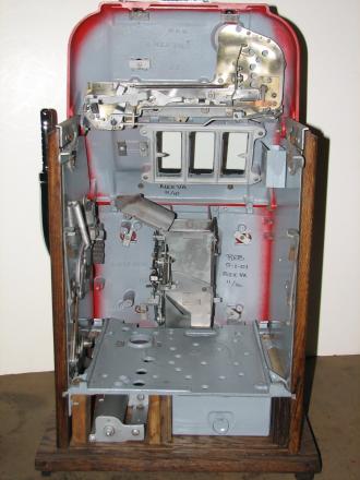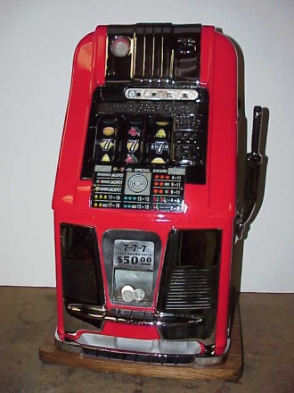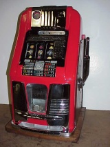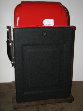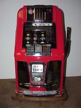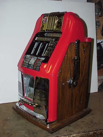 Mills 1947 " 7-7-7 " Hi-Top 25 cent, This is a very nice restored machine, Gloss Red trimmed in black. All the trim on this machine has been chrome plated to add a little flash to the gloss red color. Mint condition award card, Jack pot with reserve, original back door and lock with one key, original cash box. The 7-7-7 token vendor has been removed before we received this machine.