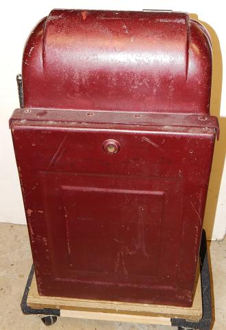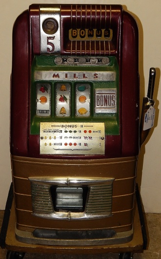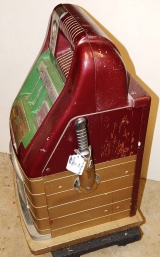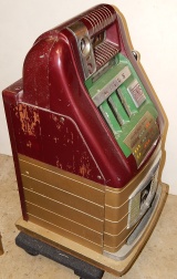 Mills 1948 Bonus Hi-Top 5 cent with the Hard to find Bonus feature. Original condition, colors of Burgundy and Gold. Very nice original oak cabinet, jackpot with reserve, original reel strips. Original award card, original cash box, original back door, original Mills lock with one key. When the BONUS letters on the first reel come up in order, corresponding letters will appear at the top right of the machine. Once the entire word BONUS is spelled out, you win 18 coins. This was another way Mills would try to keep people playing longer and if you had almost all the letters showing, it was hard to walk away.