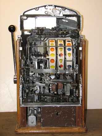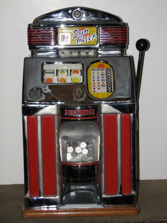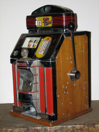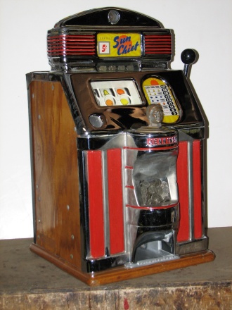 1951 Jennings Sun Chief, 5 cent. Very nice original machine not restored, original cash box, original back door, reel stripes have been replaced by previous owner.