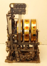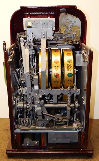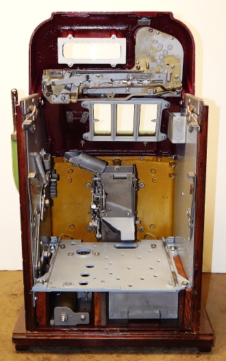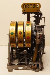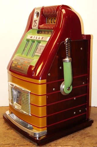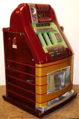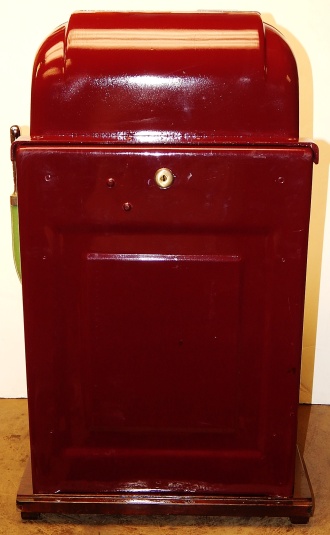 Mills 1948 Bonus Hi-Top 25 cent with the Hard to find Bonus feature. Previously restored, colors of Burgundy and Gold. Very nice original oak cabinet, jackpot with reserve, new reel strips. Mint condition original award card, cash box, original back door, original Mills lock with one key. When the BONUS letters on the first reel come up in order, corresponding letters will appear at the top right of the machine. Once the entire word BONUS is spelled out, you win 18 coins. This was another way Mills would try to keep people playing longer and if you had almost all the letters showing, it was hard to walk away.