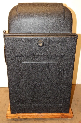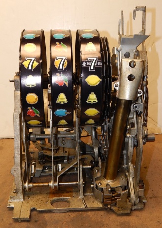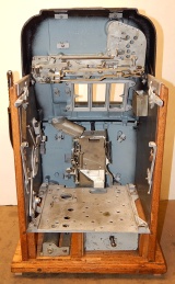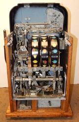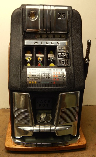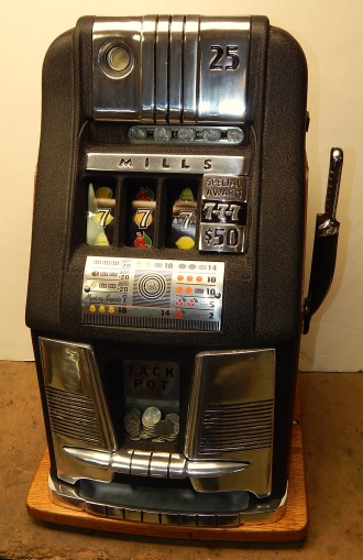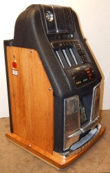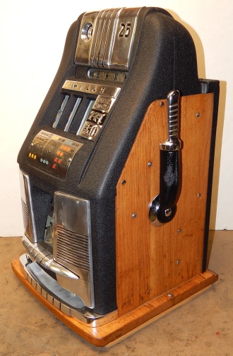 Mills 1950 Hi-Top 7-7-7 25 cent. This is a very nice machine restored in wrinkle black. The cabinet on this machine is all oak wood finished. Mint condition award card, Jack pot with reserve, original back door and Mills lock with one keys, original cash box, new black reel strips. Plays very easy.