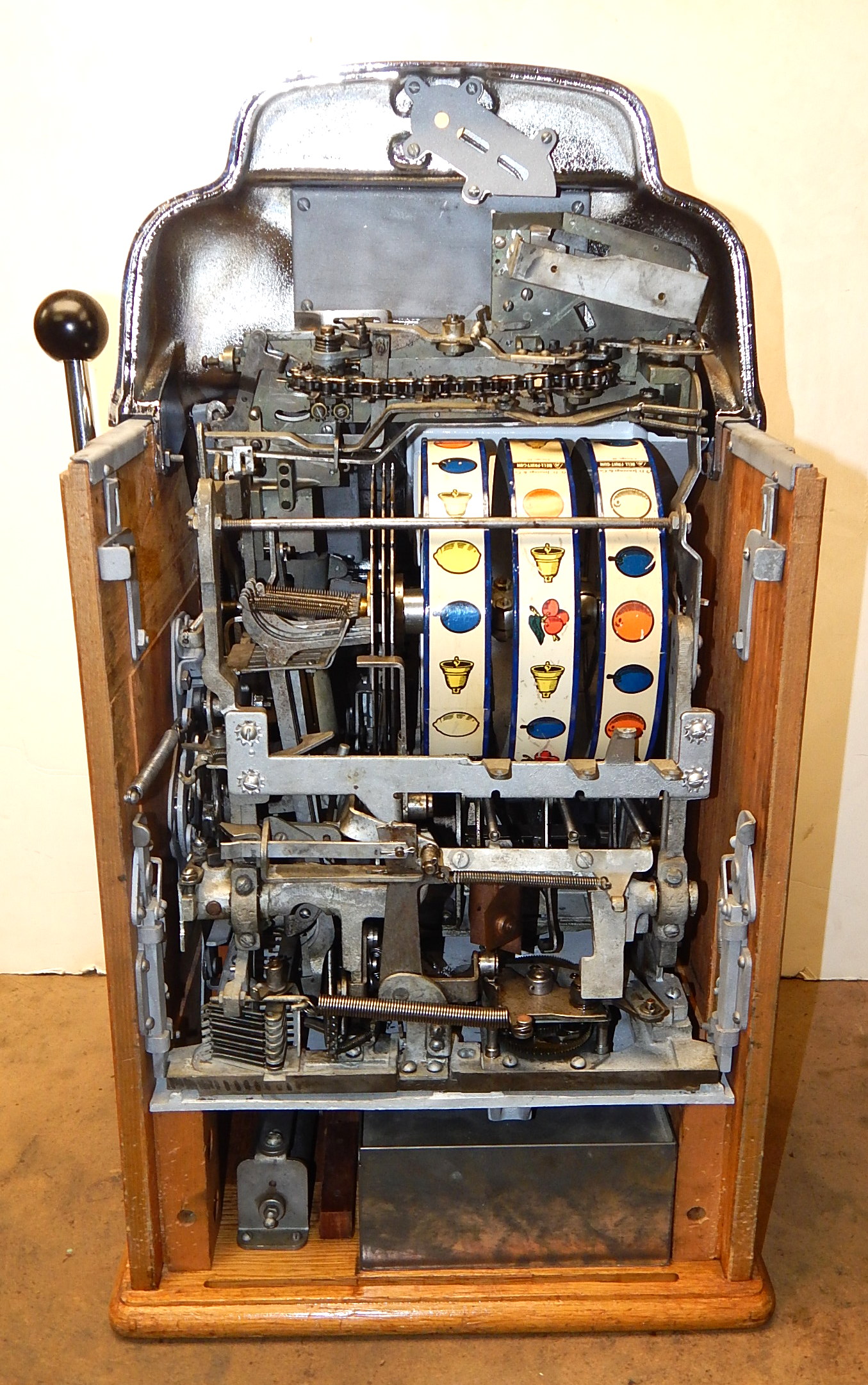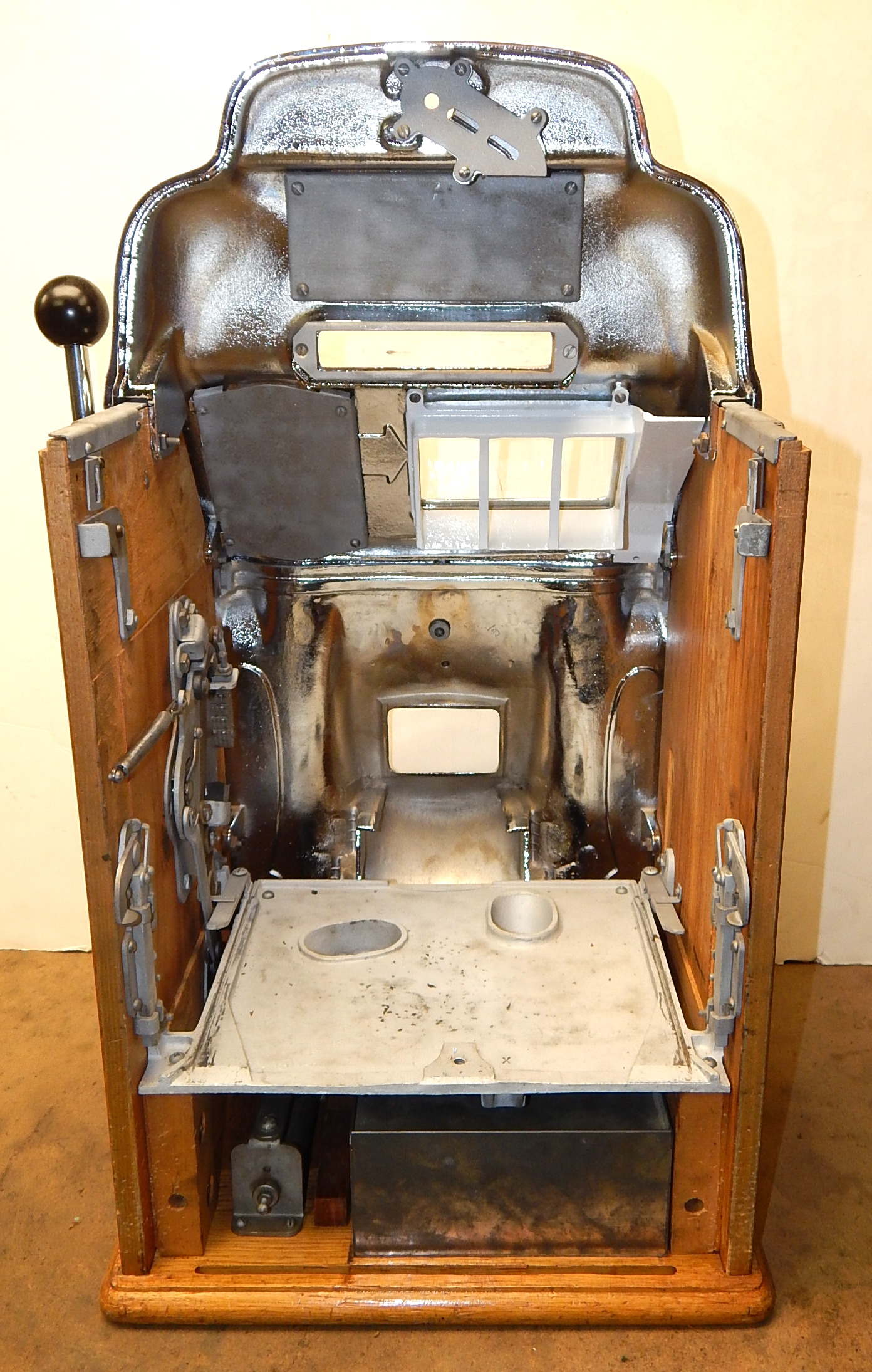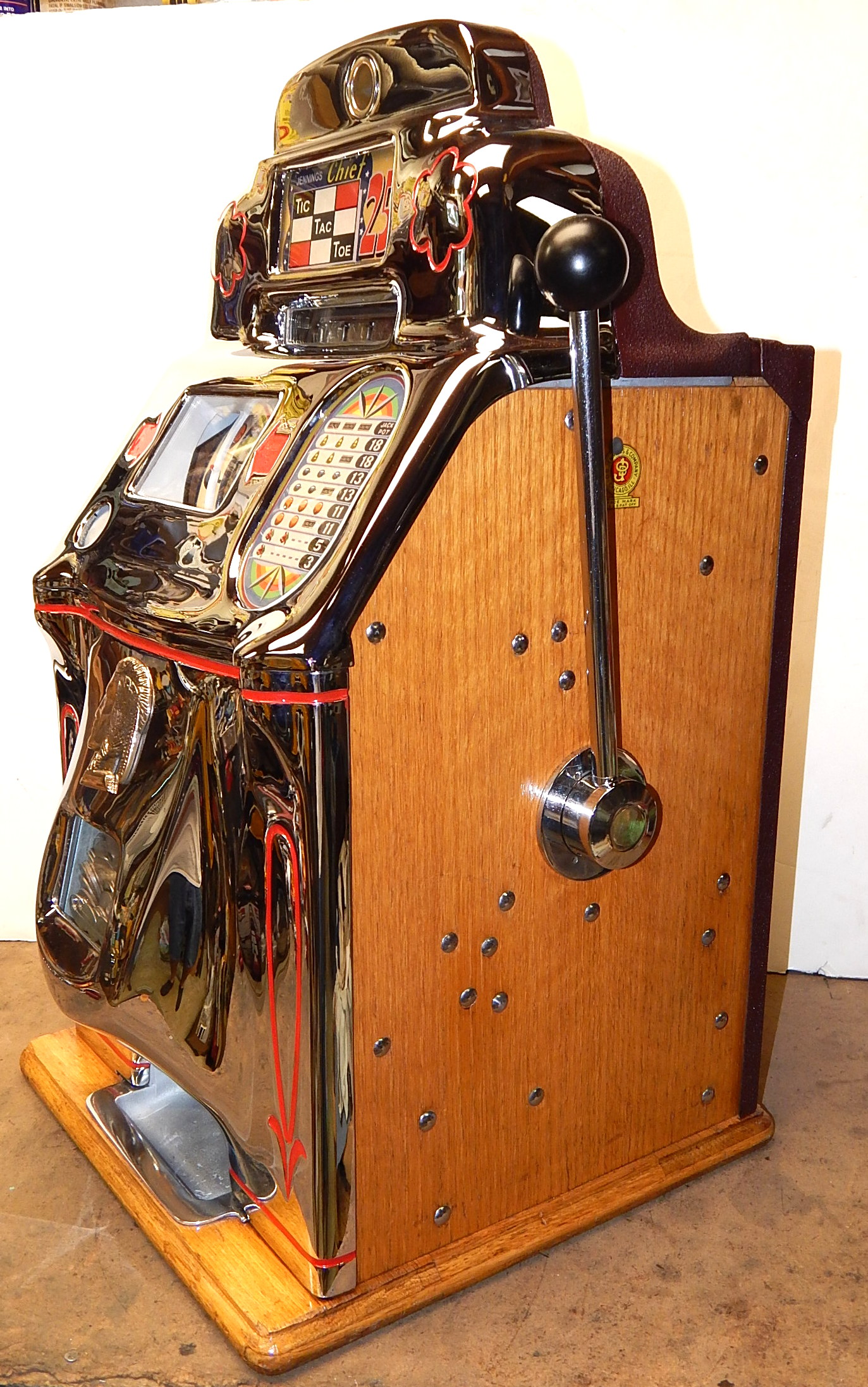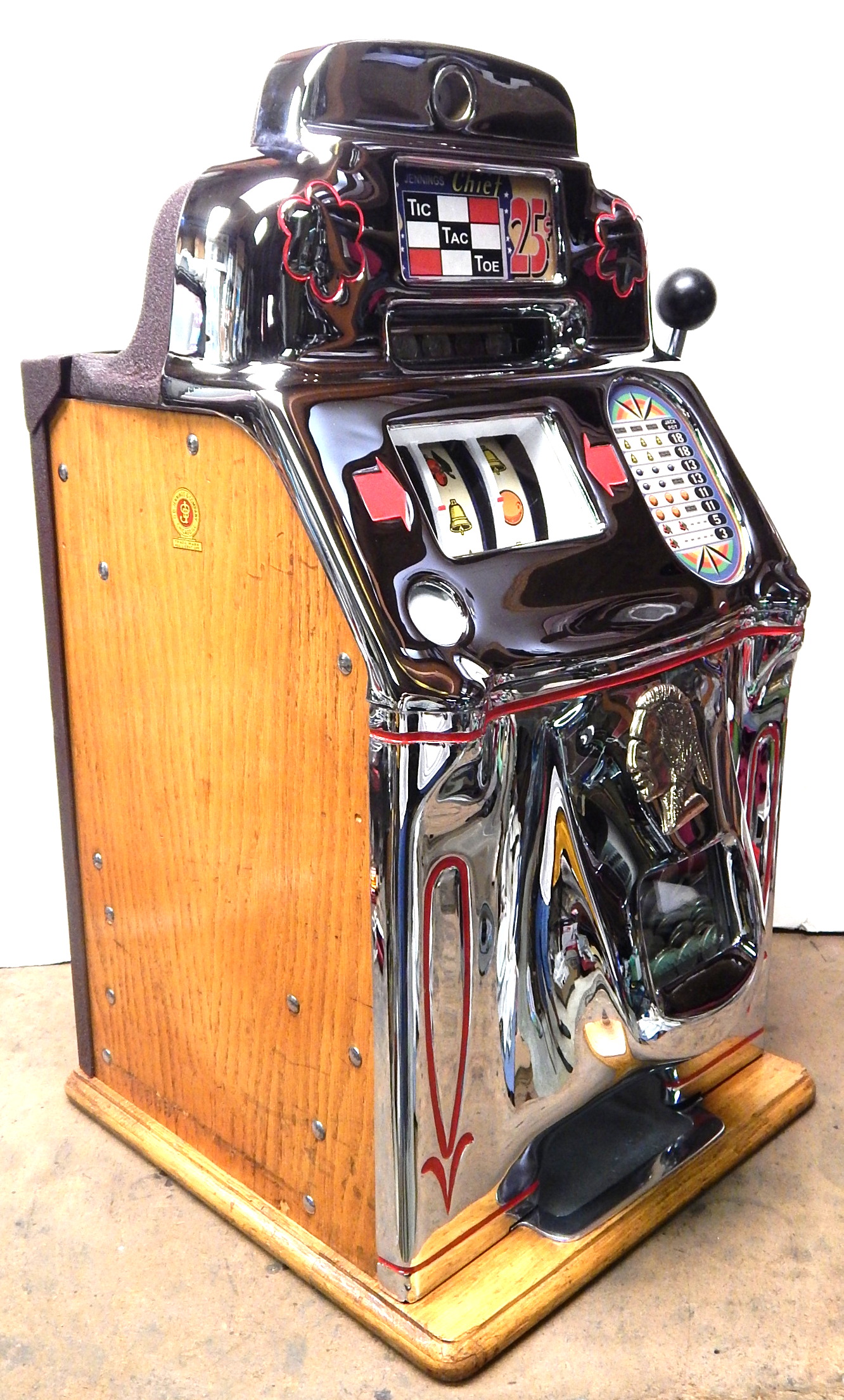 25 cent Jennings Standard Chief. Restored Triple plated chrome 10 out of a 10, with full function self feed Jack-Pot, Original mint condition Reel Strips. original back door , new Cash box , original Jennings lock and Key # ODJ -2200. Plays very nice.