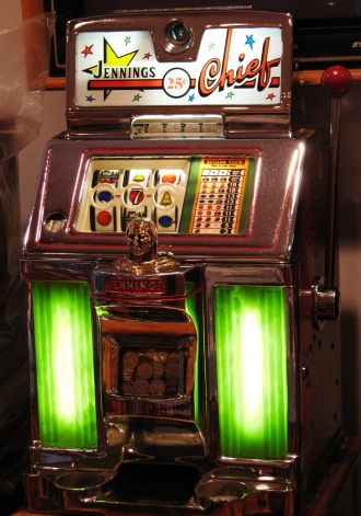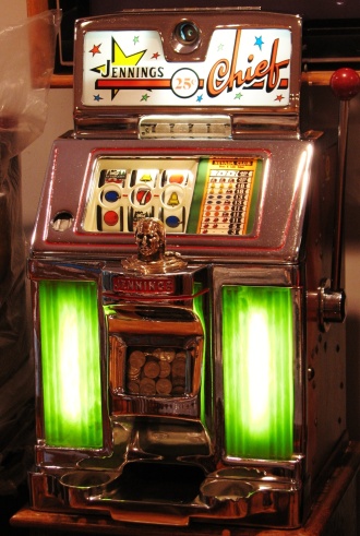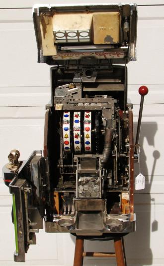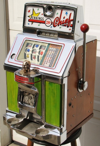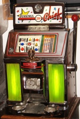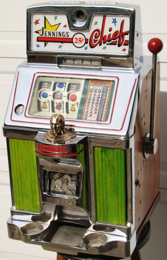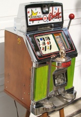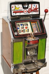 1964 Jennings (lite-up) Nevada Club 3 Reel Continental. 25 cent denominations, with front-load functioning jackpot. The chrome plating on this machine is 9 out 10. The cabinet has green plastic and lites up very nice. Pulls easy, plays and pays as it should.