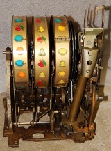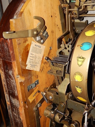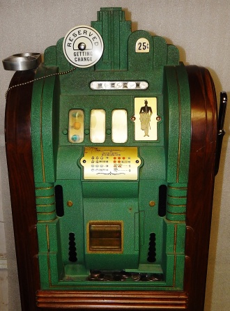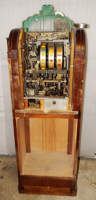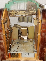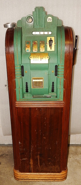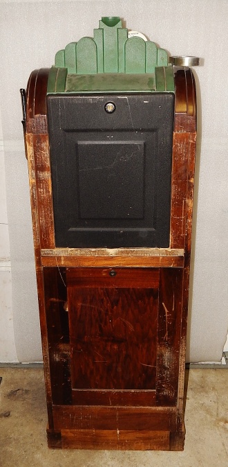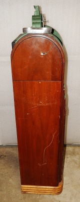 Mills 1946 Club Royale Bell 25 cent in console cabinet, all original the way it left the factory. This is a very nice un-restored machine in its original colors. Original cash box, original back door with Mills locks and keys, original Jackpot. Plays very easy, 2-5 payout. The scuff's on the cabinet are very minor. If it does not sell as is I will restore the cabinet back to it beautiful walnut condition. The height of this machine has been determined by unmistakable test as the only correct height for all type of players. The cabinet is noteworthy for its graceful modern lines, not extreme but beautiful and attractive beyond the expectation of what a bell machine might ever be.