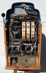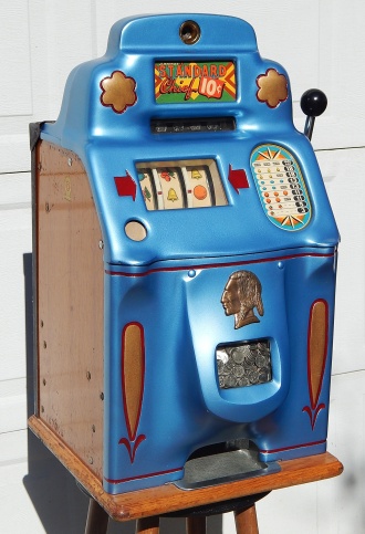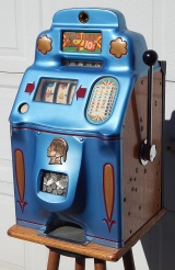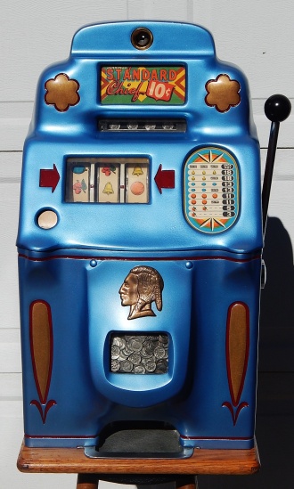 1947 Standard Chief 10 cent, previous restoration, painted Blue trimed in gold. This machine has original cash box, Jennings back door, reel strips changed by previous owner. Plays and pays as it should with a full jackpot with reserve.