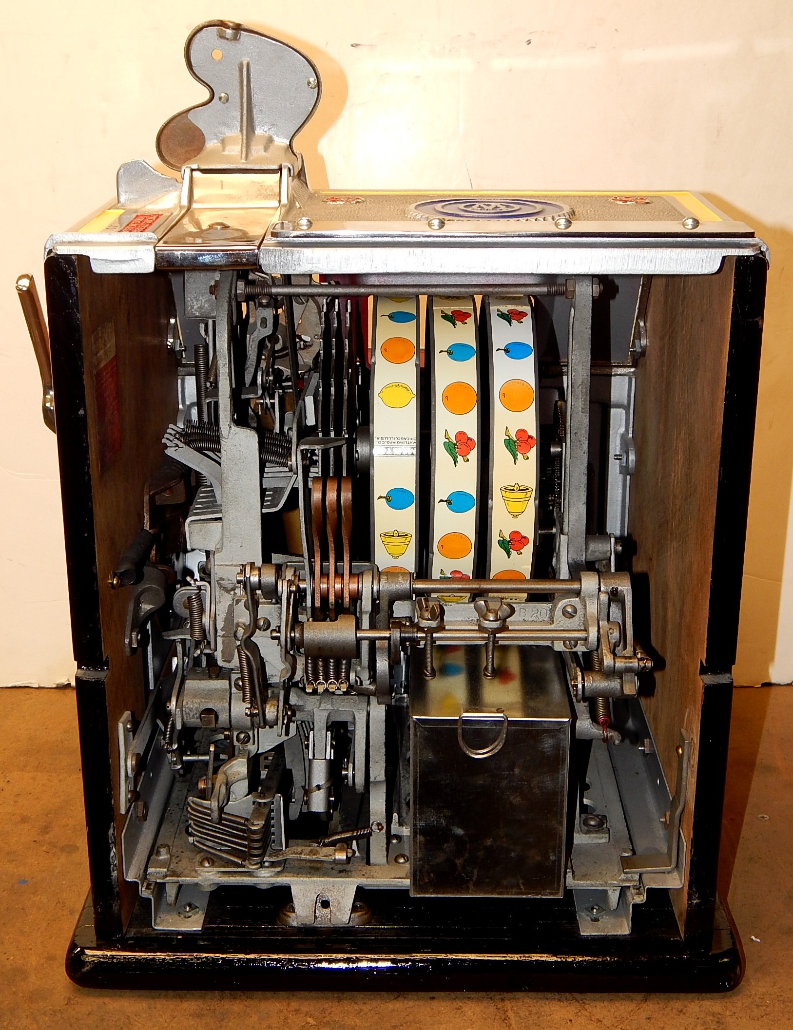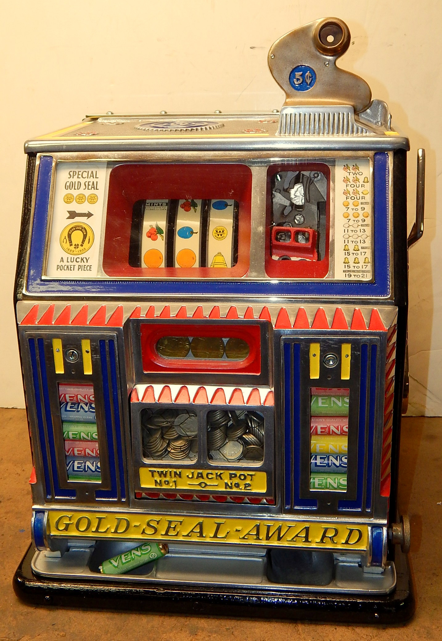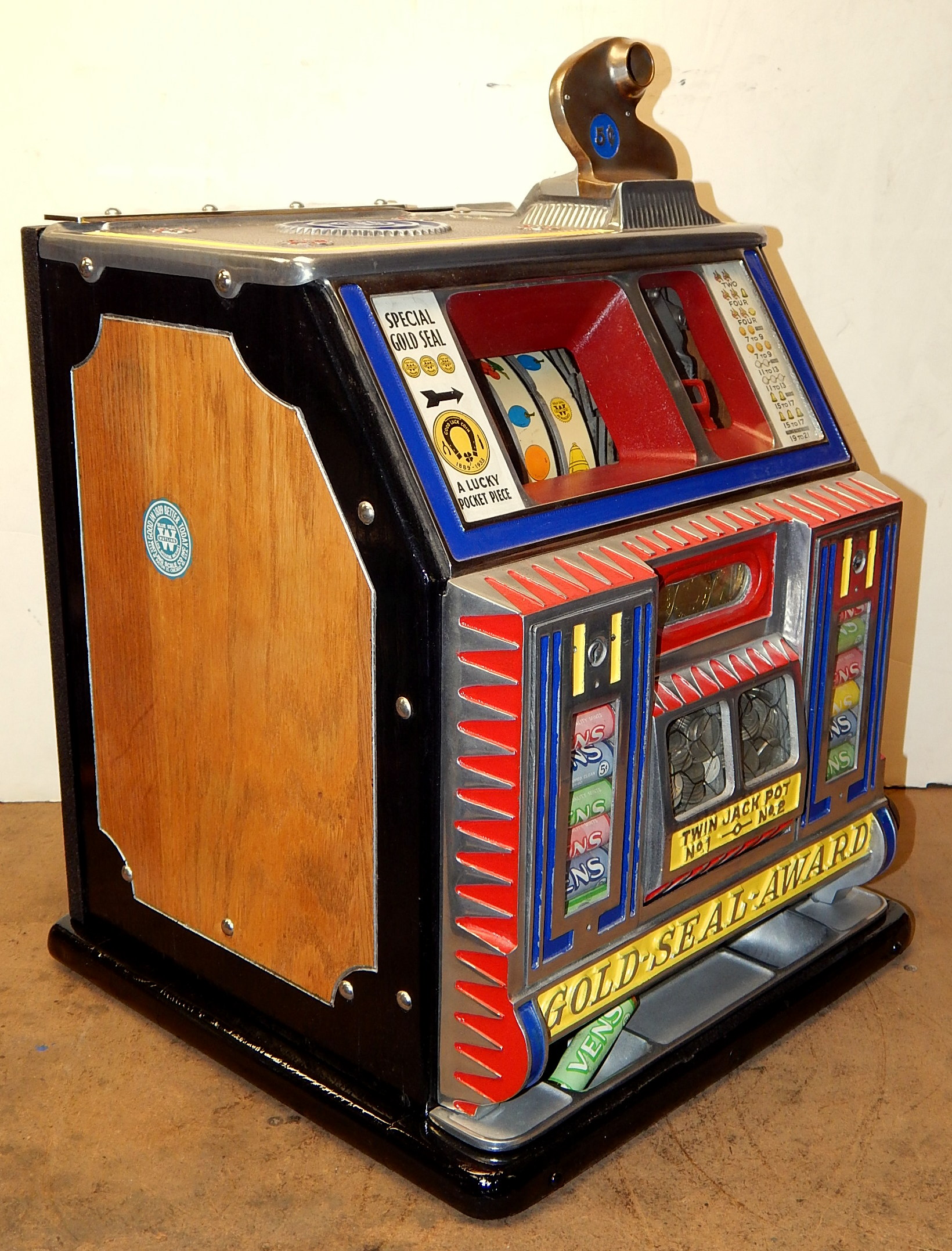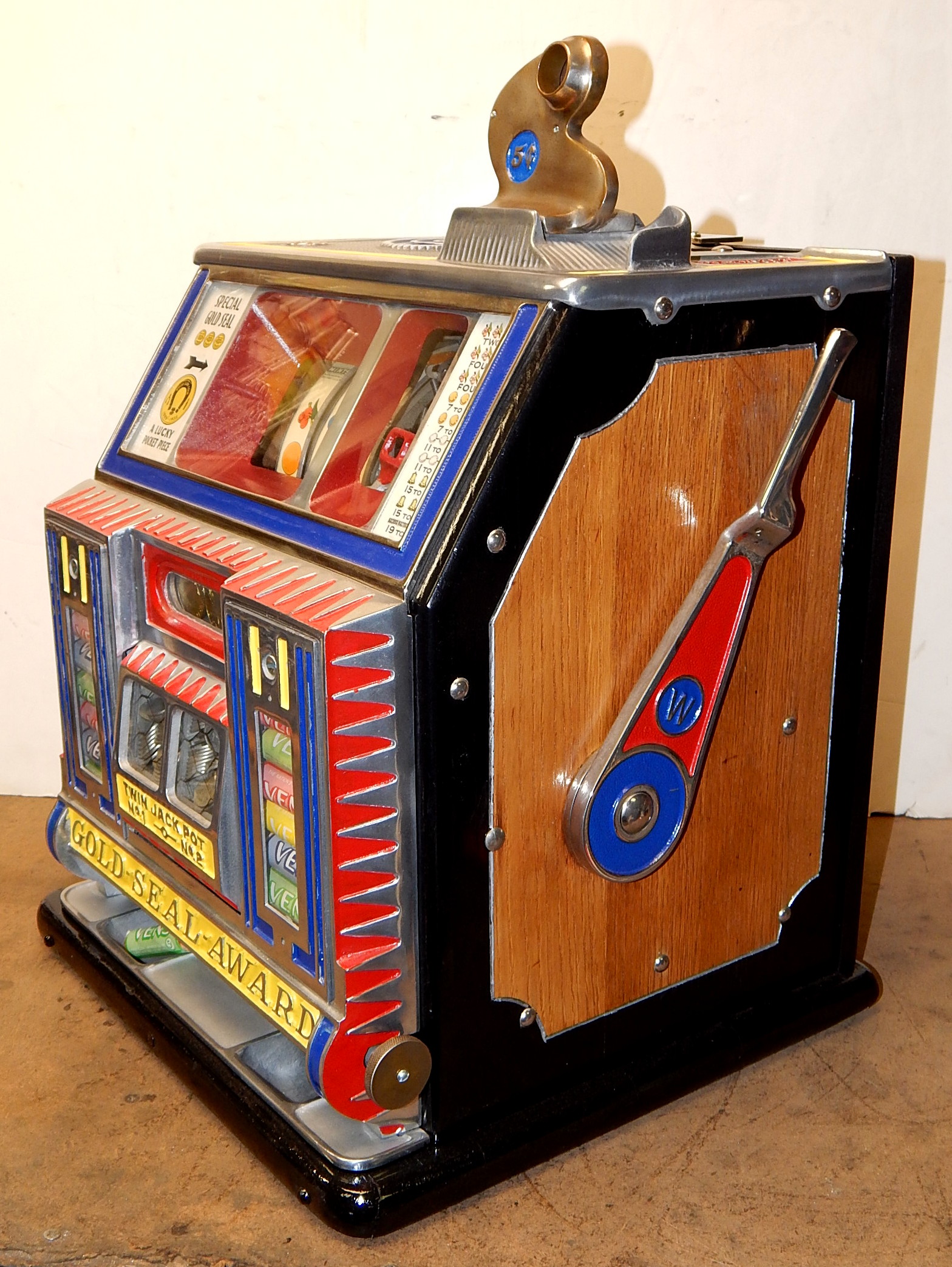 1933 Watling Baby Bell "Gold Seal-Award" 5 cent, Previously restored back to original condition. Polished, not chrome plated. Twin jackpots, Mint Vendors, Gold Award vendor with four tokens, new cash box, new back door. Plays and pays as it should. Very nice machine.