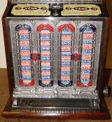 1925 Mills Front O.K. four Column Vendor, 5 cent Restored back to original condition. Polished not plated. Mint vendor, which give you a roll of mints every play. This was Mills way to get around the gambling laws back in the day. The only thing not original on this machine is the marquee card on the front. It even has the original Mills locks with Mills name on the keys from 1925. The gold leaf and Mills decals on the sides are original as well. Original tin reel strips. The way you want to find them. Plays great and pays as it should.