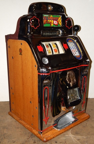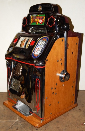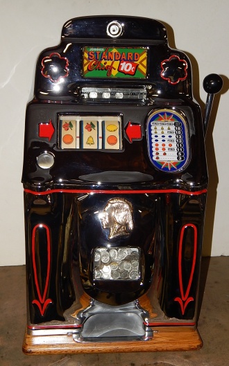 1947 Jennings "Chrome" Standard Chief 10 cent, a very nice machine. The chrome plating on this machine is a 10 out of 10, just beautiful. Everything on this machine is original but, the new chrome plating. Original cash box, back door. 3-5 payout