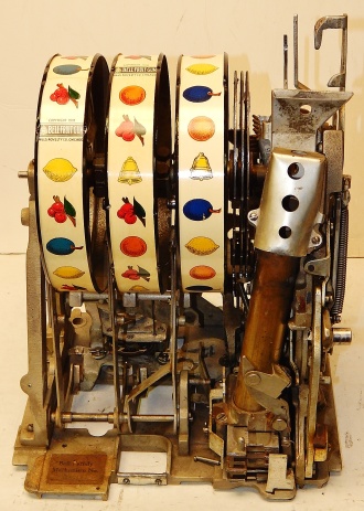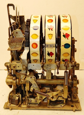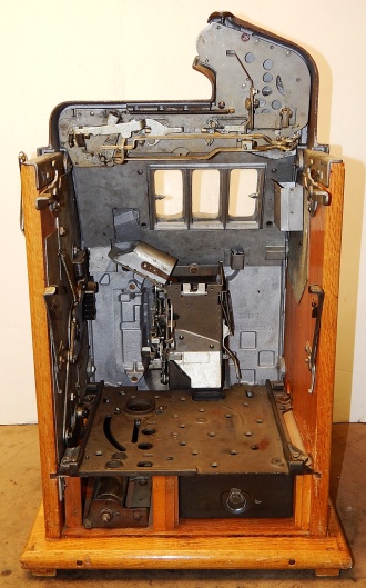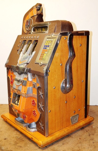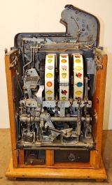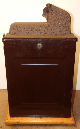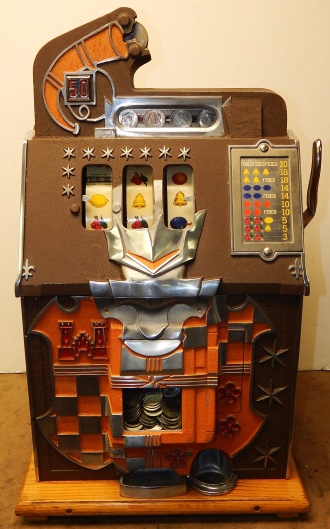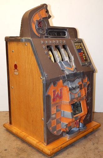 1935 Mills Castle Front 50 cent. Another very nice all original large coin machine. Original colors, wrinkle brown trimmed in red and orange. Jackpot with reserve, original reel strips, original back door, original Mills lock with one key, original cash box. Mint original oak cabinet. Plays very easy, 3-5 payout.