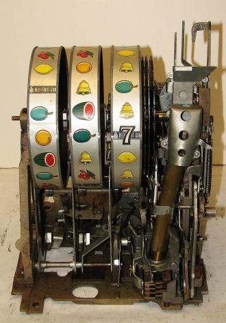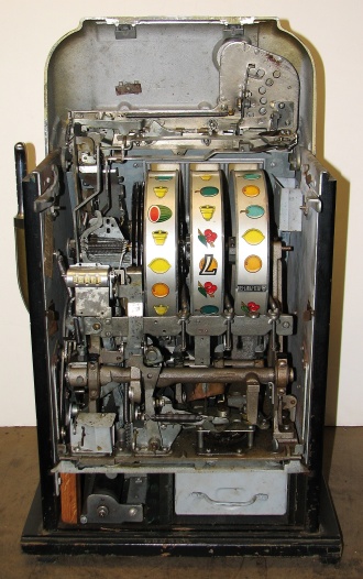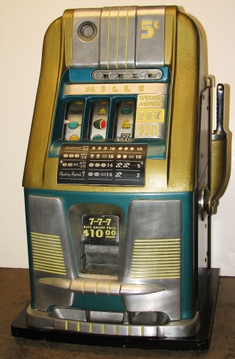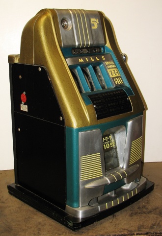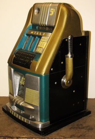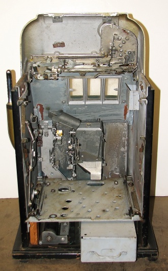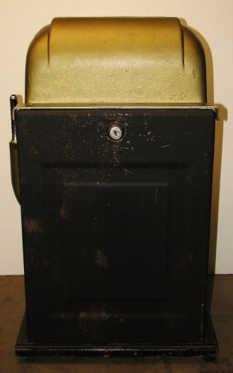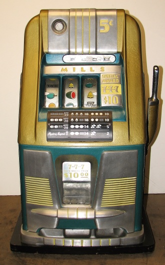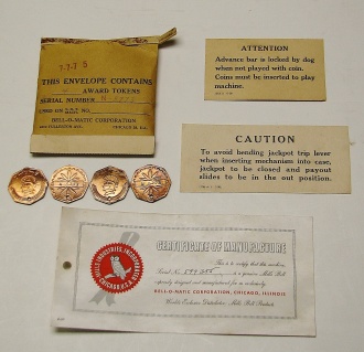 1951 Mills "7-7-7" Hi-Top 5 cent, in original condition, reel strips are in mint condition. Full Jackpot with reserve. Mint original cash box. This machine comes with 7-7-7 token vendor with four original tokens, the 7-7-7 tokens still have the original envelope they came in. The back door has the original Mills lock with two orignal numbers matching keys. When I open the cash box, I found all the original paper work for this machine. The escalator and Jackpot look to be in new condition. From what I can see, there is no evidence this machine was in service, If you are looking for a nice original machine untouched here you are. This machine is a 9 1/2 out of a 10. Cleaned, lube and adjusted . Ready for many years of trouble free play.
