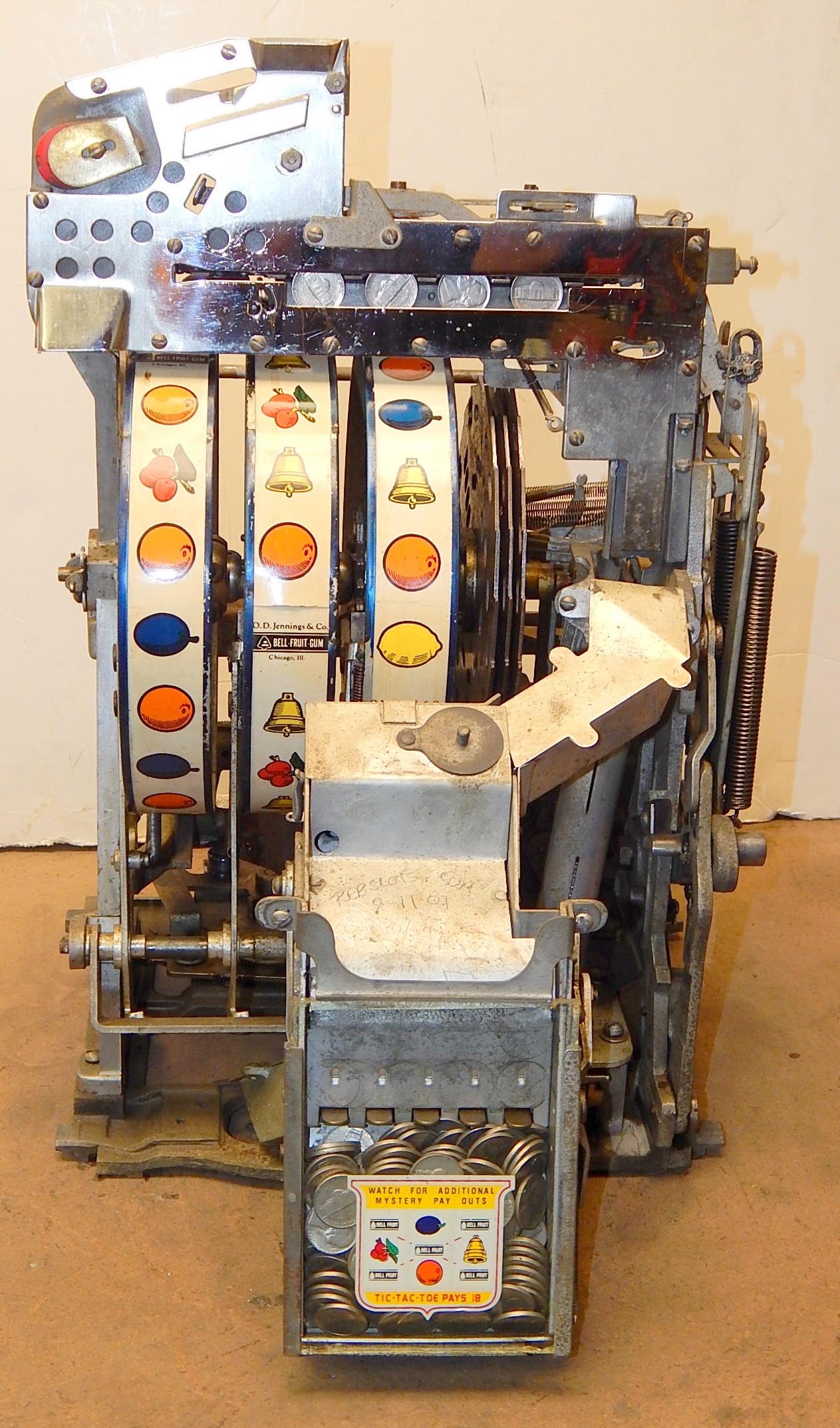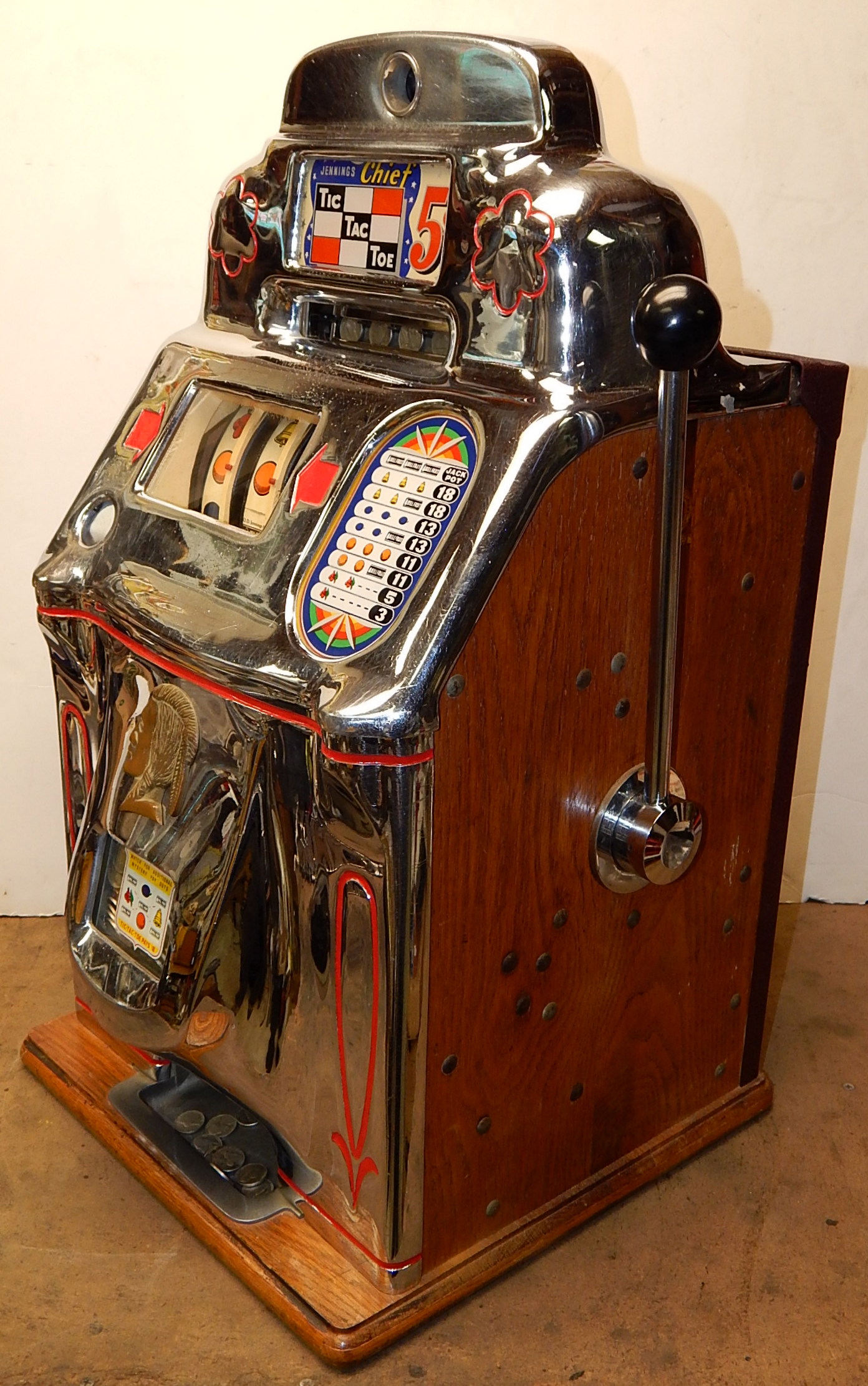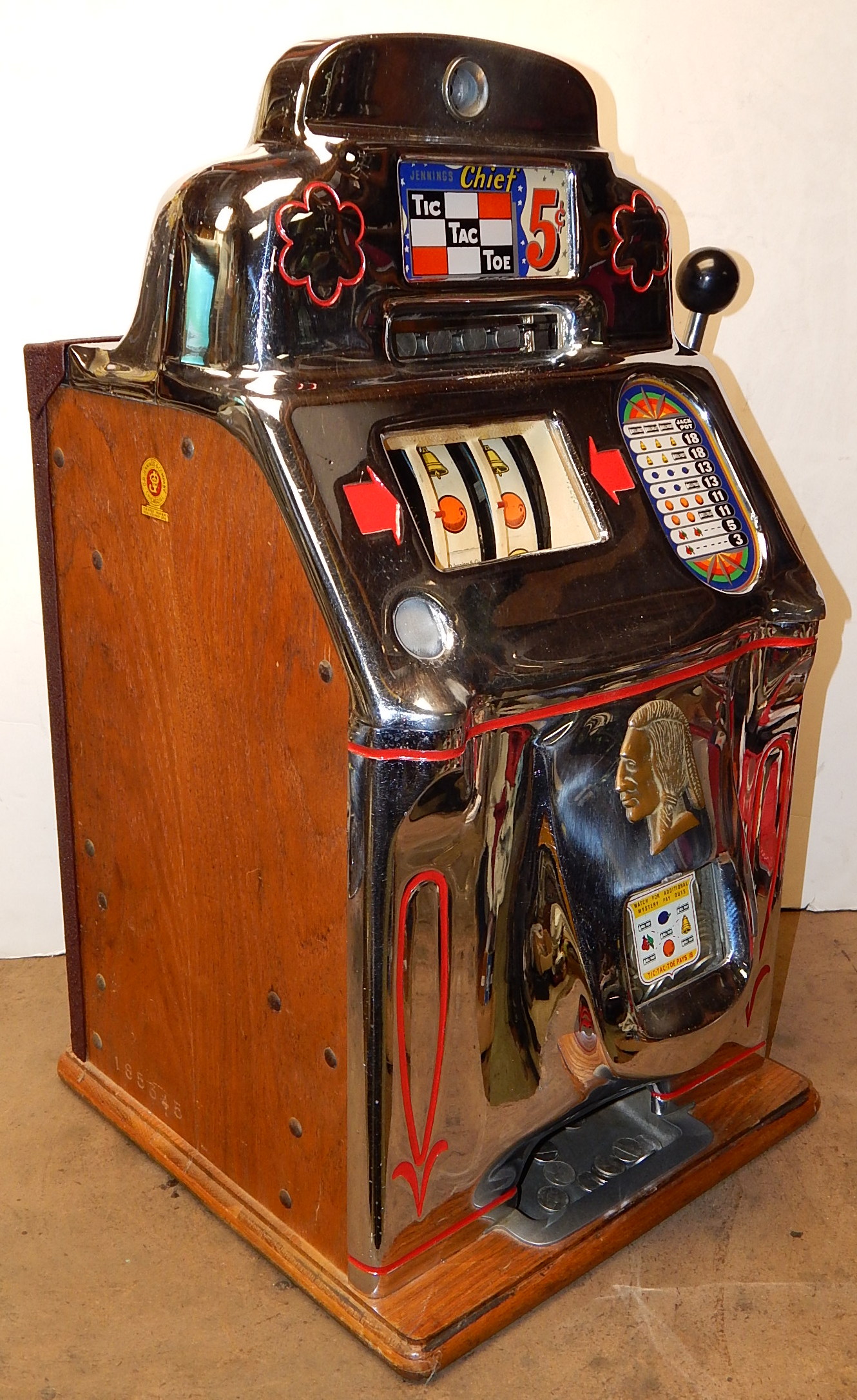 1948 Jennings Standard Chief 5 cent, a very nice original machine with matching numbers. This machine still has it's original chrome looks great for 74 years old, just beautiful. Original, cash box, back door with original ODJ Jennings lock and key. Plays nice and easy, pays as it should.
