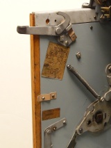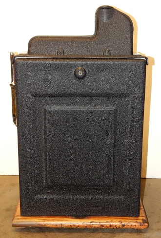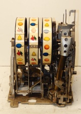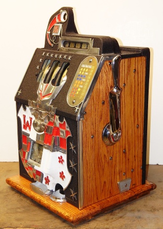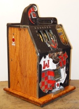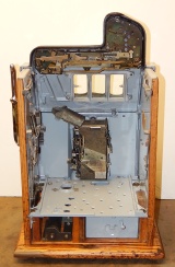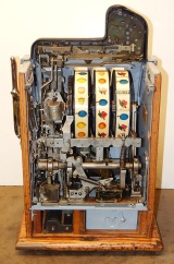 1934 Mills Castle Front 25 cent. Another very nice all original machine, the only thing that is not original is the paint. Restored back to it's original colors, wrinkle black trimed in red and white. Jackpot with reserve, original reel strips, original back door, original Mills lock with one key, original cash box. Original oak cabinet. Still has the original paper work on the inside of the cabinet. This is the way you want to find them. Plays very easy, 3-5 payout.