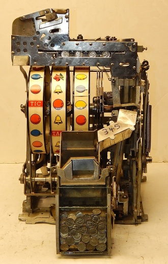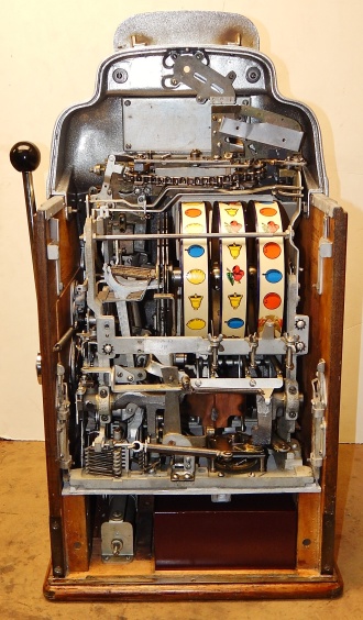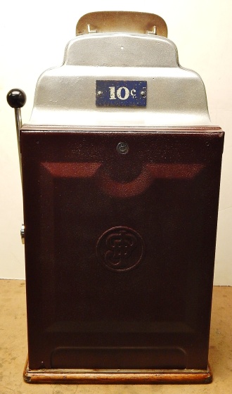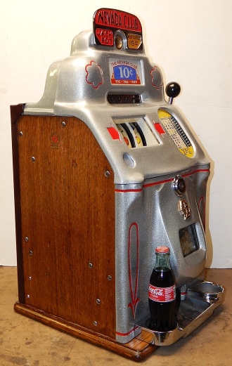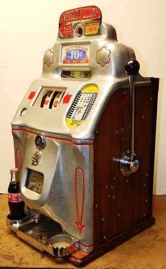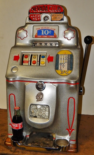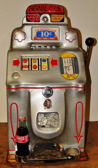 1947 Jennings Standard Chief 10 cent "Tic Tac Toe" Nevada Club. Powdered Coated Silver Flake, trimmed in red. This machine still has all the Nevada Club art work use the covert this beautiful machine in to a Nevada club slot machine back in the day. Bars pay 18 coins when they are in a tic, tac, toe fashion. This machine also has the Wild Eagle on the first reel, any time that comes up on the first reel on the center line its wild. The chrome plating on this machine is a 9.9 out of 10, just beautiful. Front load working Jackpot. Original, back door, reel strips, award card, marquee, oak cabinet front and back Ace locks. Plays and pay as it should.