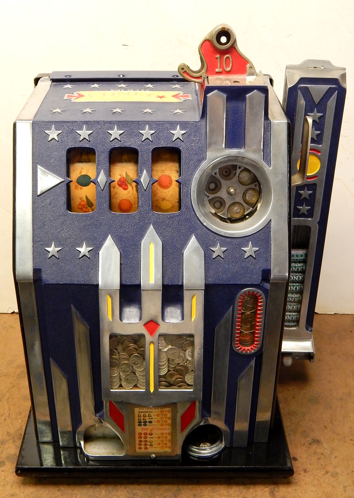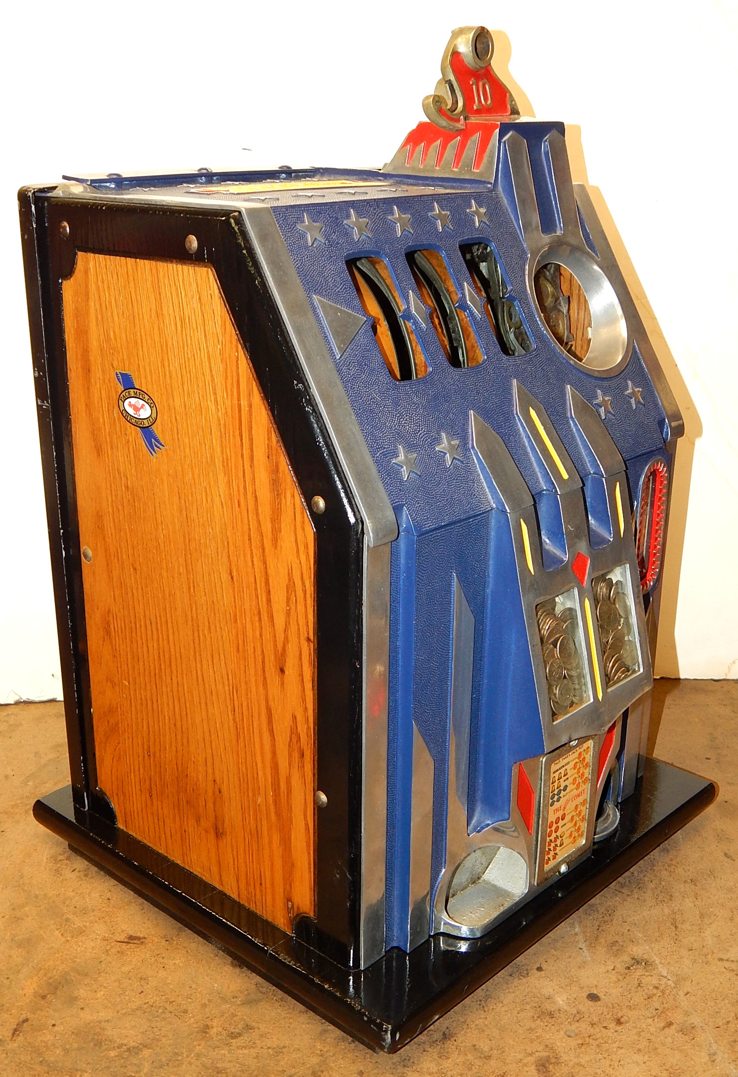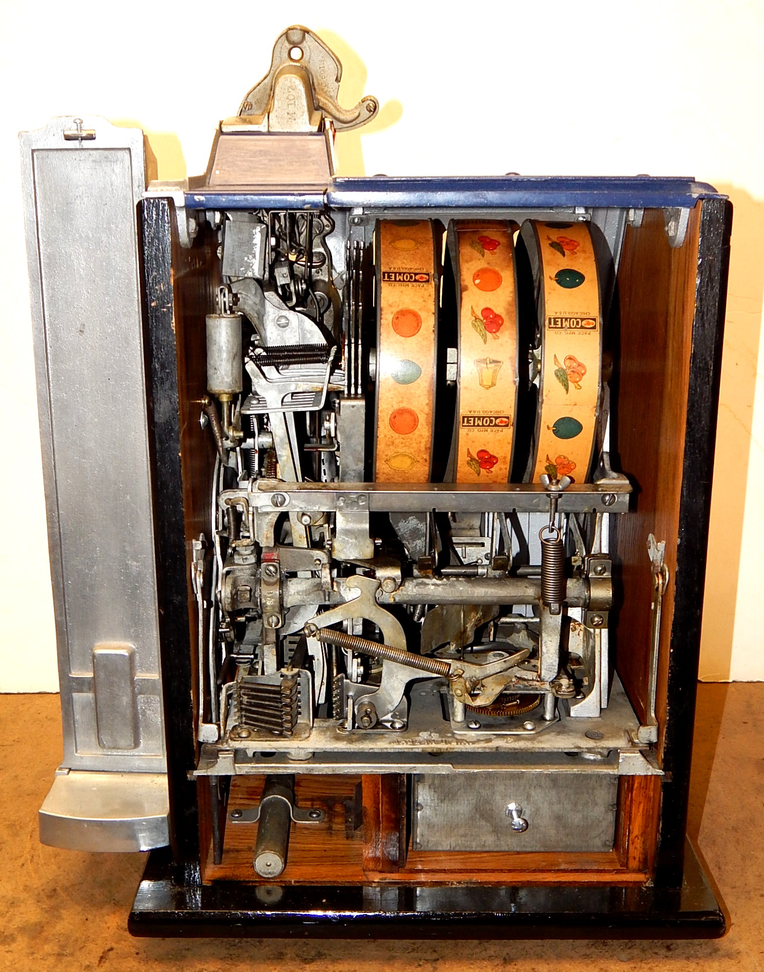 1936 Pace Comet 5 cent, with Gold Award token vender, mint verder. Previously restored back to the original colors Blue, trimmed in red and yellow. Original reel strips, new award card. Original back door with lock and key. Original cash box, functional twin jackpots. Plays and pays as it should.