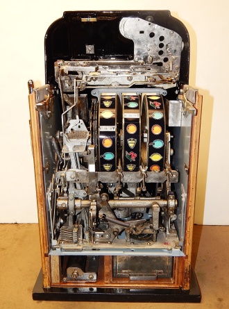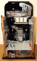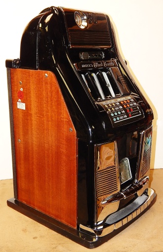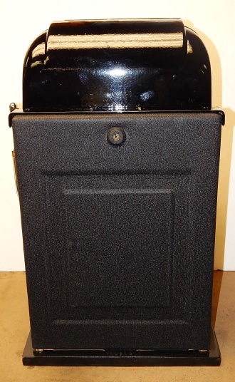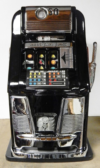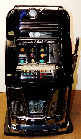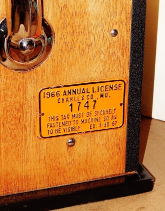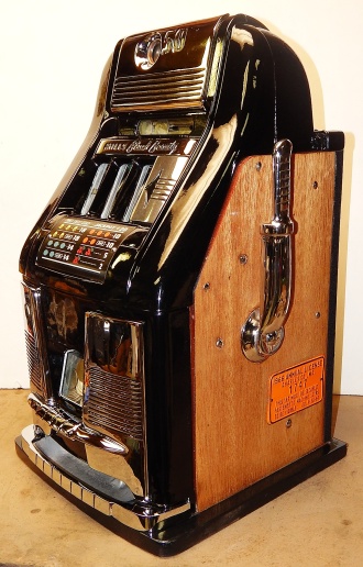 Mills 1948 Black Beauty 50 cent, This is a very nice restored large coin machine, painted powder coated High gloss Black. The trim on this machine has been chrome plate to add a little flash to this beauty. Mint original award card, black reel strip, Jackpot with reserve, original back door with original Mills lock with one key, cash box. The original license plate from 1967 Charles County Maryland mounted on the side. Plays very easy. 2-5 pay out.