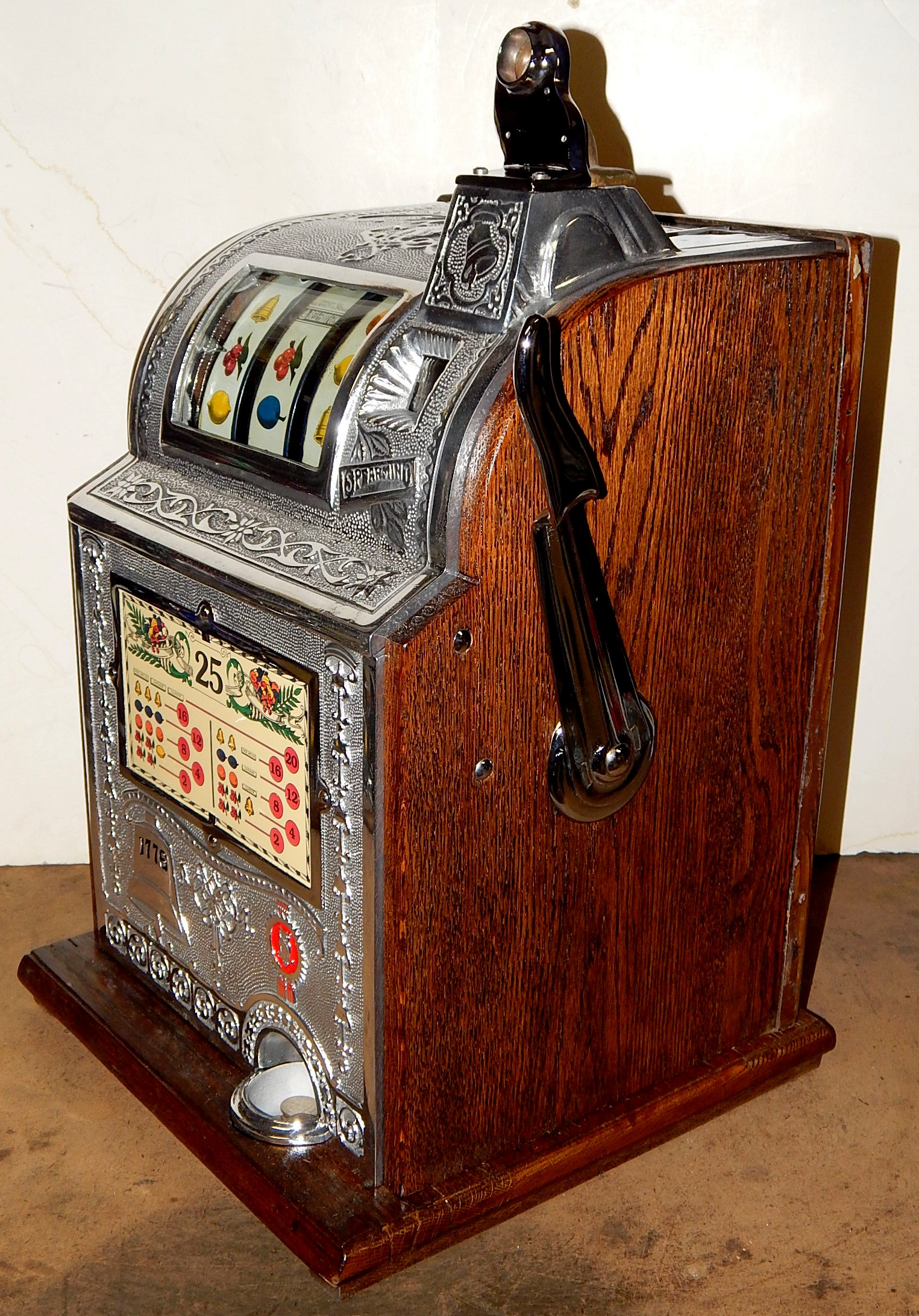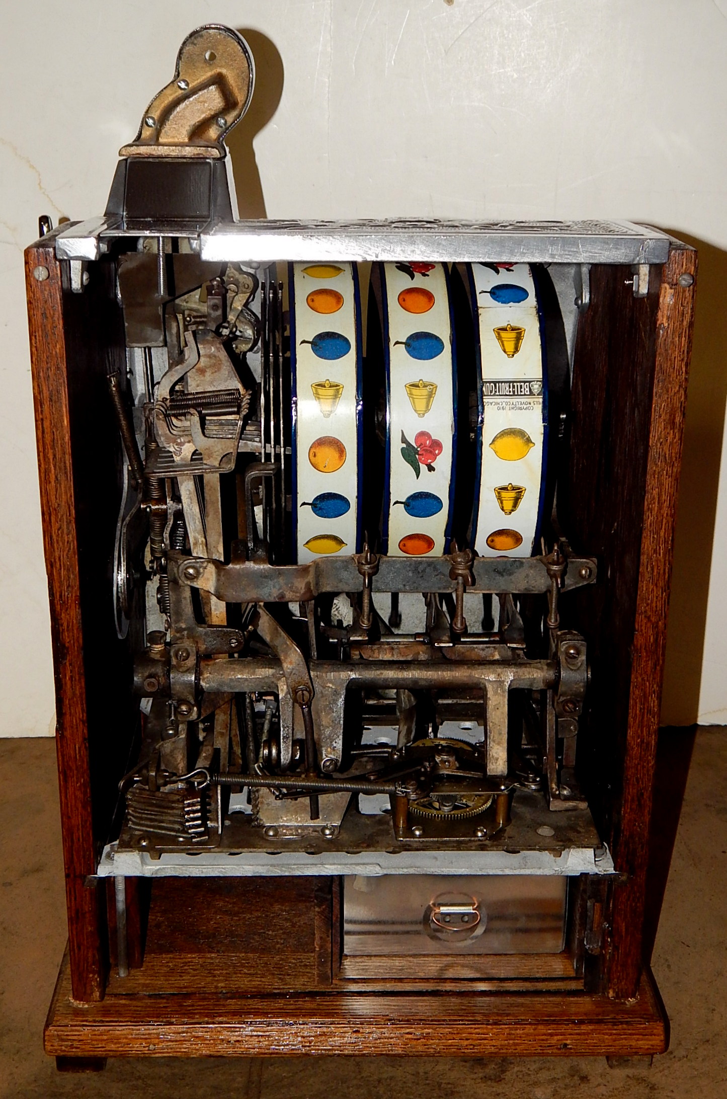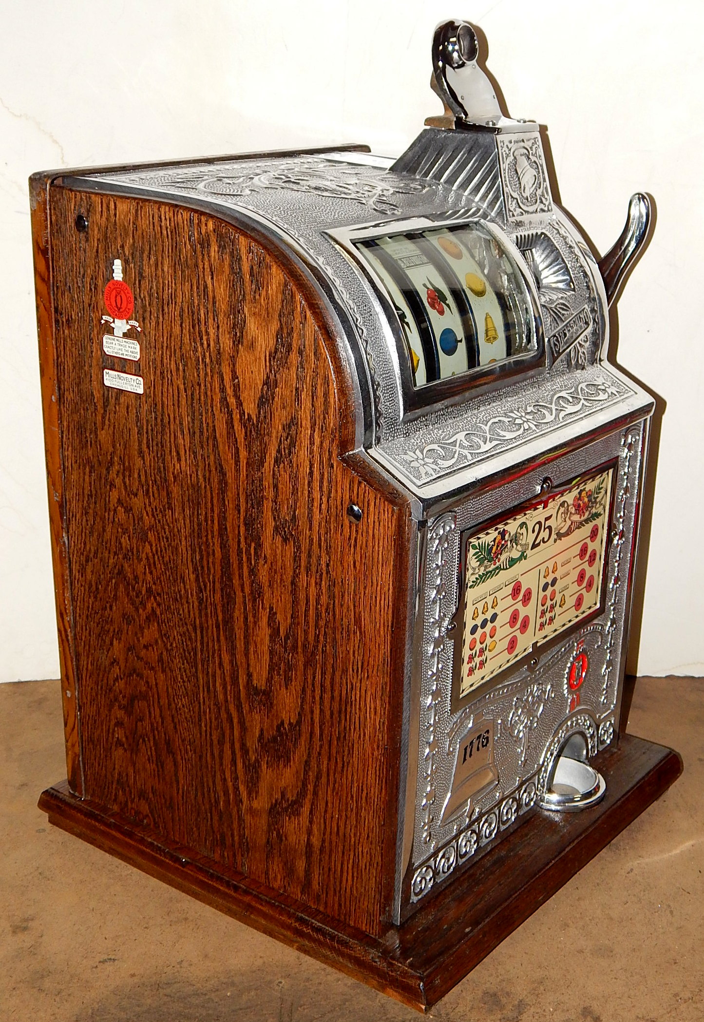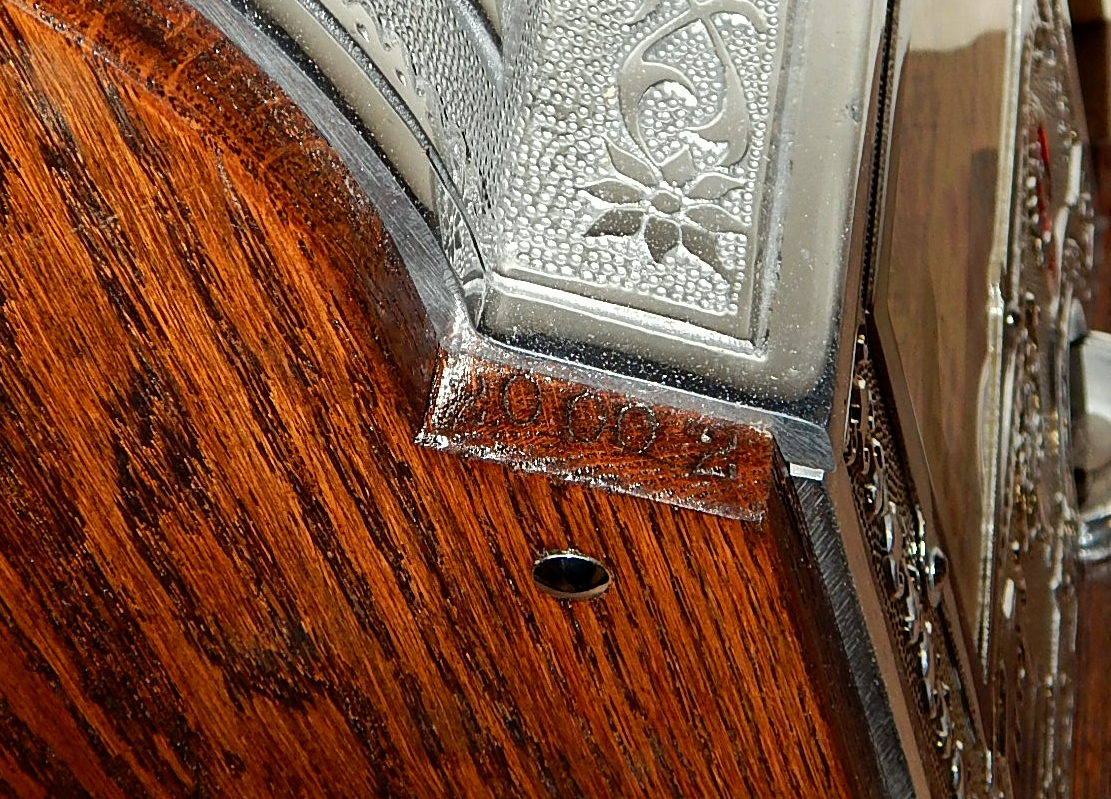 1915 Mills Operator Bell, 25 cent. Here is an old one, The castings on this machine are polish not chrome plated, casting are mint condition. This machine needs nothing, has the original condition back door. Still has the original tin reel strips on this machine that are 8 out of a 10 in condition, not bad for a 105 years old machine. New cash box new award card. Not many of these were made in a quarter back then, that was a lot of money to play in a slot machine. For a goose neck machine it plays very easy.