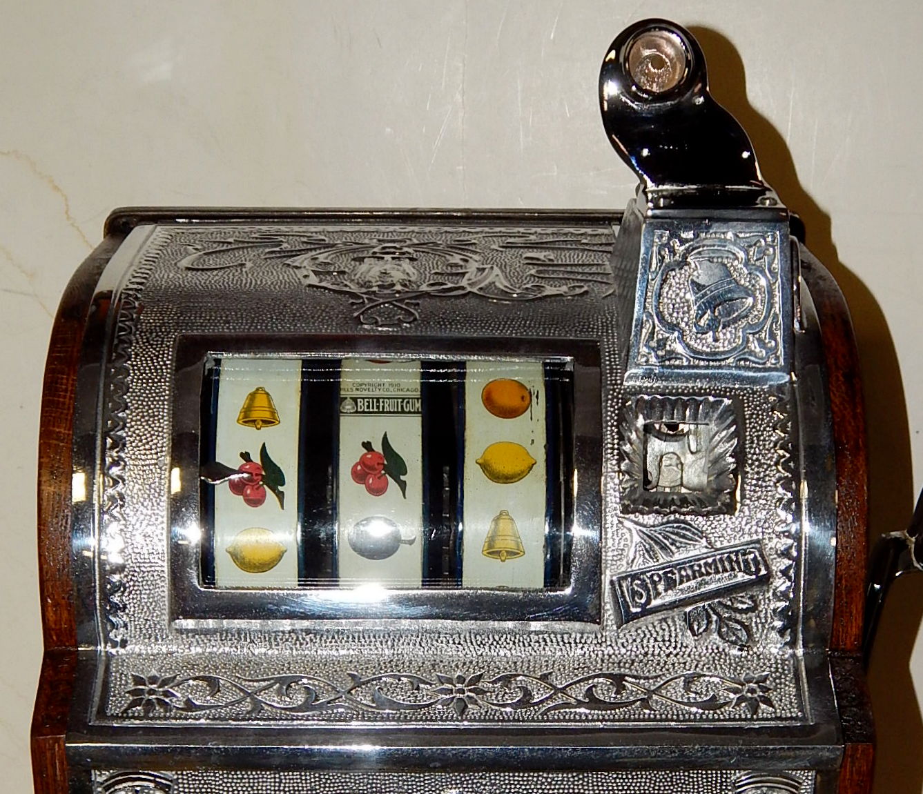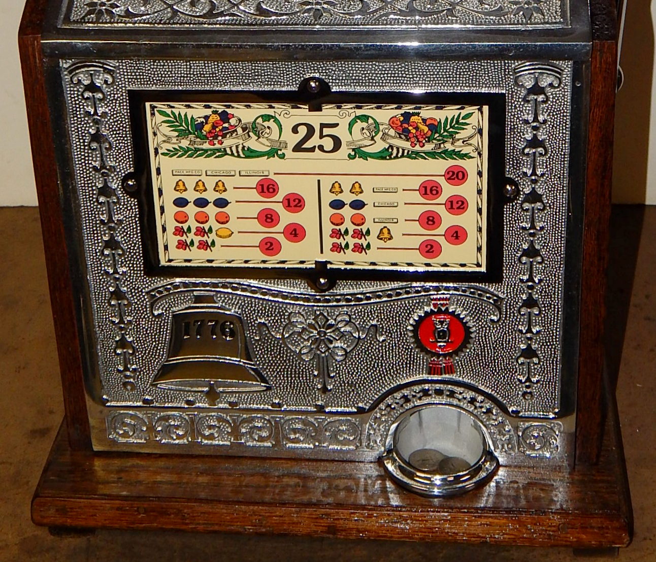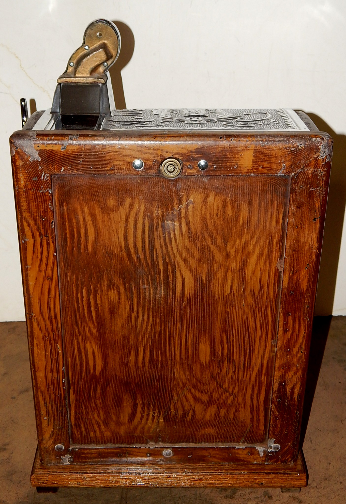 1915 Mills Operator Bell, 25 cent. Here is an old one, The castings on this machine are polish not chrome plated, casting are mint condition. This machine needs nothing, has the original condition back door. Still has the original tin reel strips on this machine that are 8 out of a 10 in condition, not bad for a 105 years old machine. New cash box new award card. Not many of these were made in a quarter back then, that was a lot of money to play in a slot machine. For a goose neck machine it plays very easy.