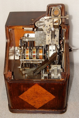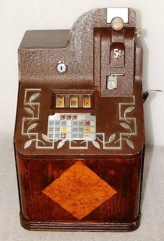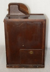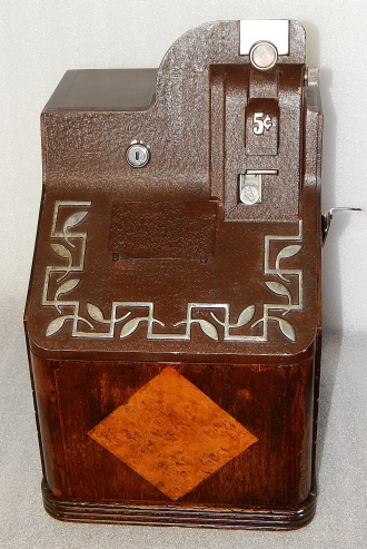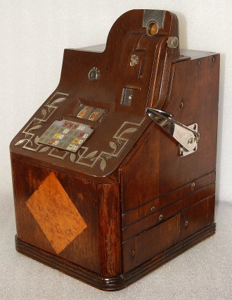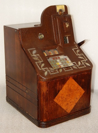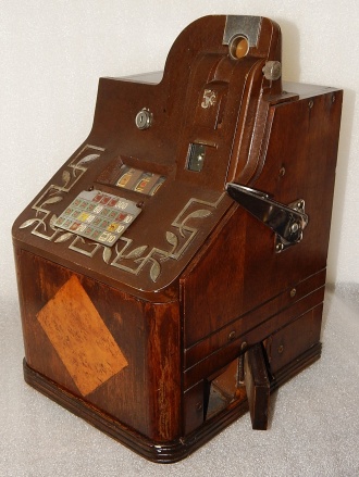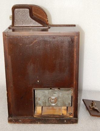 1938 Mills QT "Smoker" 5 cent. Older restoration. This is a very scarce machine. Gray and light blue in color. Original cash box, original award card, original reel strips, original Mills front and back door locks with Mills keys. Plays very easy. One of the most scarcest QT models, Introduced in 1938, with an estimated 25 to 50 known to exist. A very elegant design having a Birchwood front with diamond design inlay in place of the jackpot which was paid out by dispensed token (2 of which are included). The QT Smoker paid out on other winning combinations thru a concealed side payout tray (see picture).
