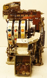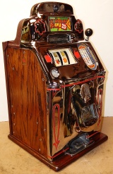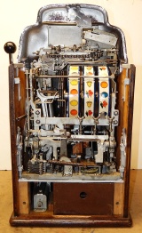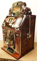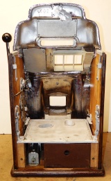 1947 Jennings "Chrome" Standard Chief 25 cent, a very nice machine. The chrome plating on this machine is a 9.9 out of 10, just beautiful. Everything on this machine is original but, the new chrome plating. Original cash box, original back door with Jennings lock and key. 3-5 payout