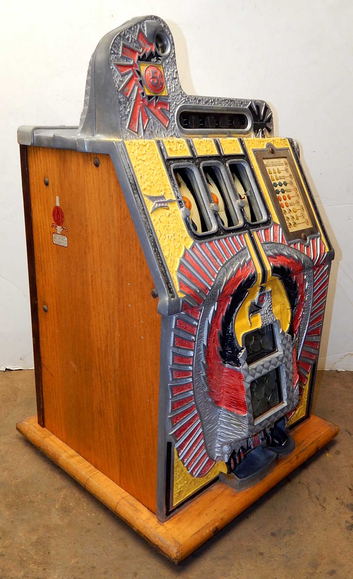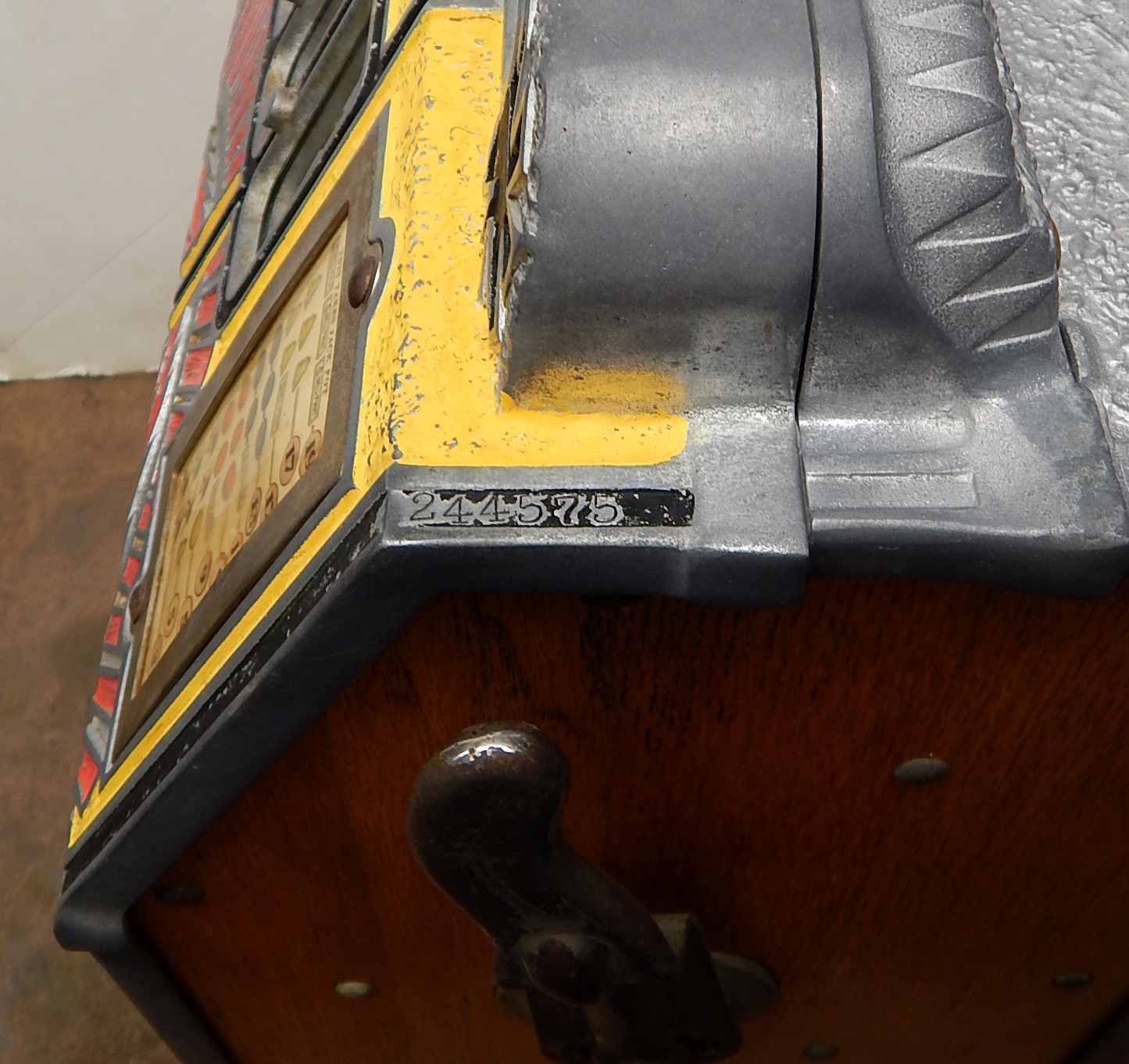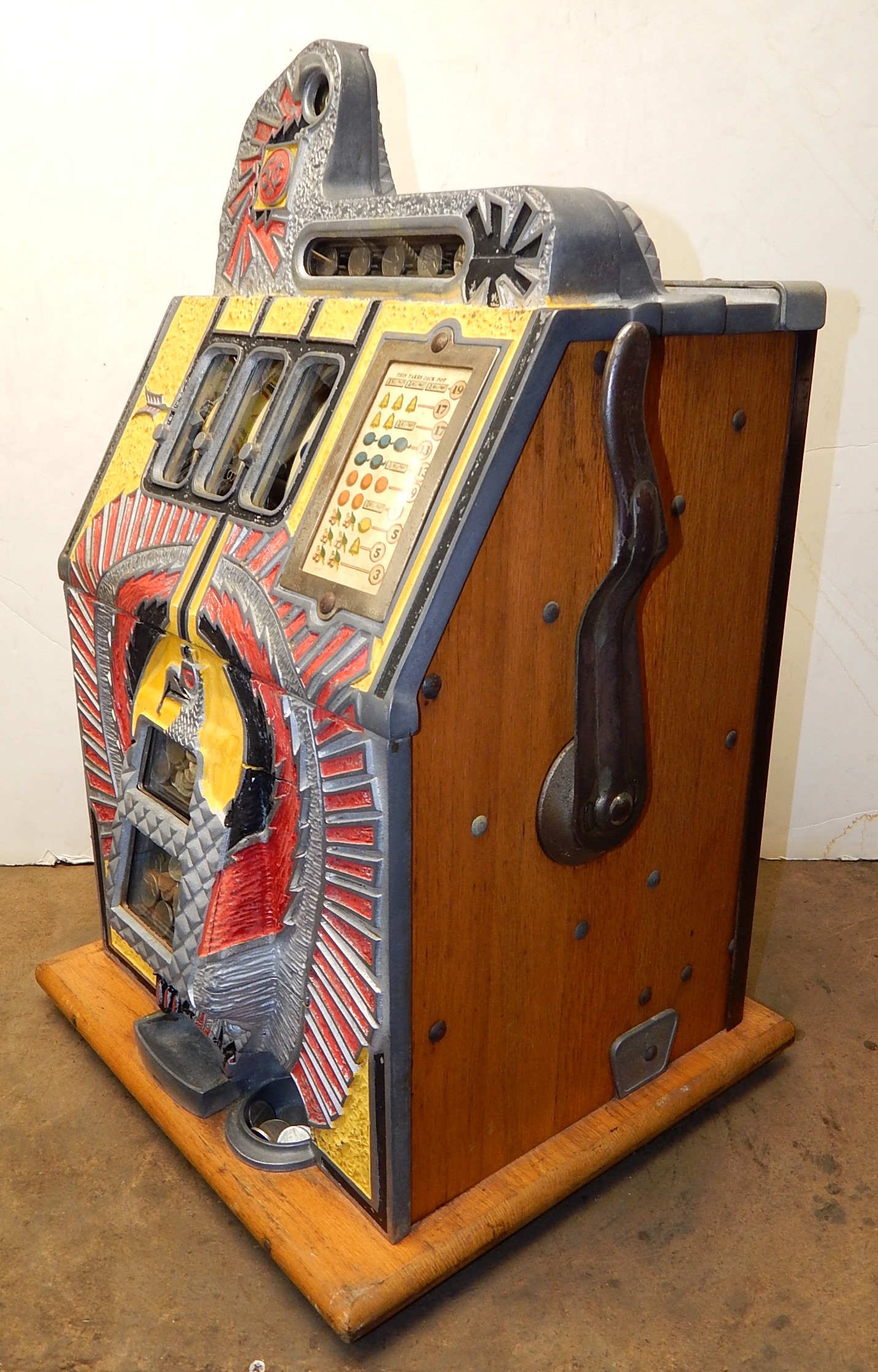 Mills 1926 War Eagle 5 cent, original condition Yellow, Red, Black. Jackpot with reserve, original back door with original Mills back door lock with one key, original cash box. Very nice oak cabinet with Mills decals. If your looking for a nice orignal machine here it is.