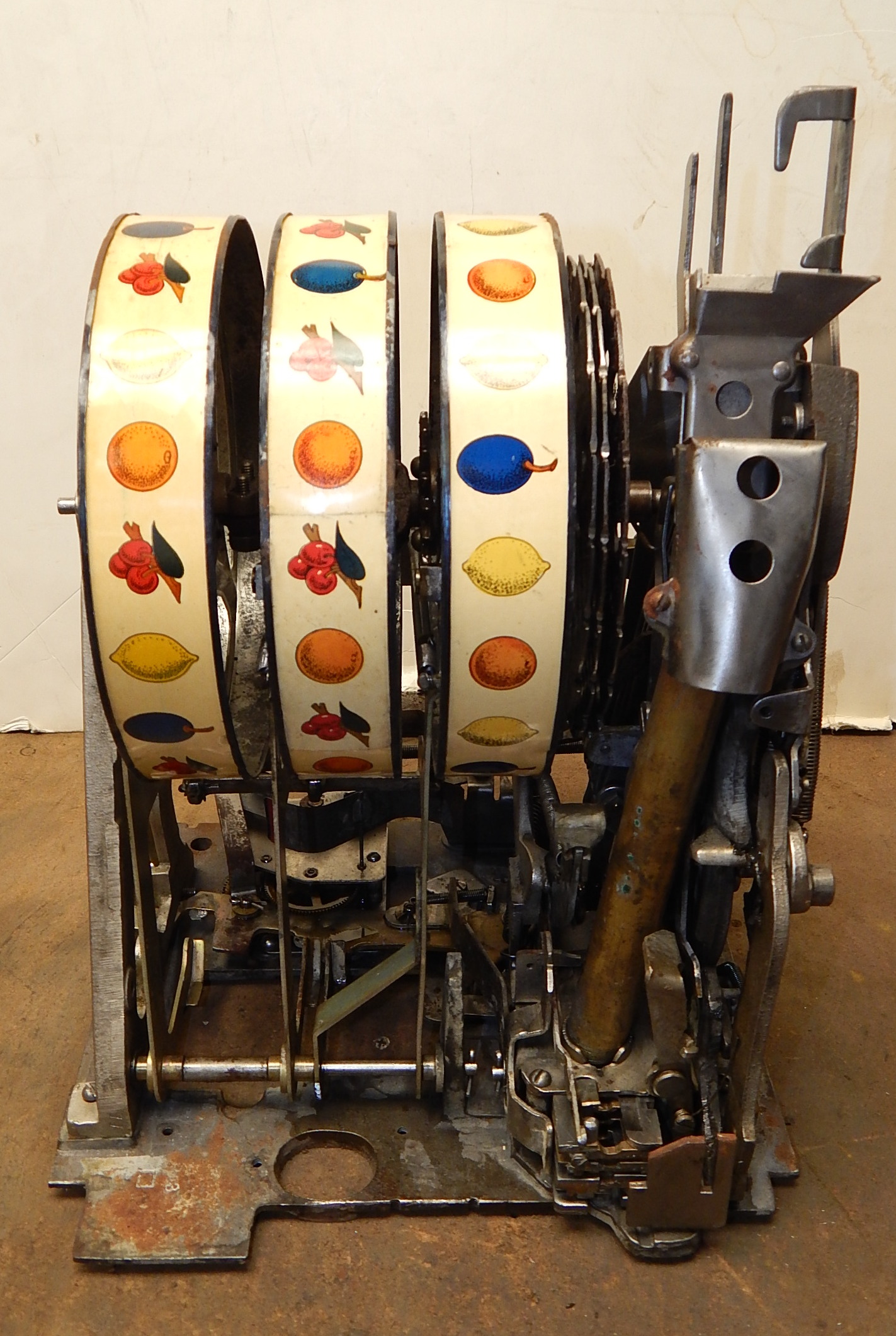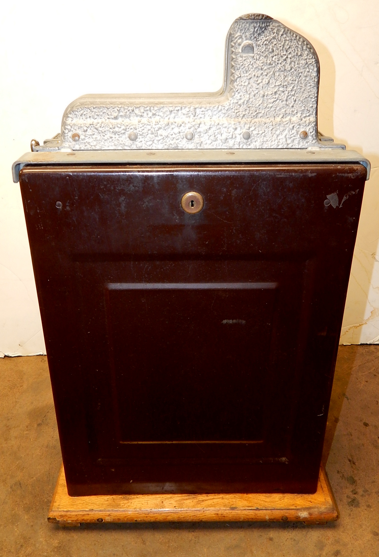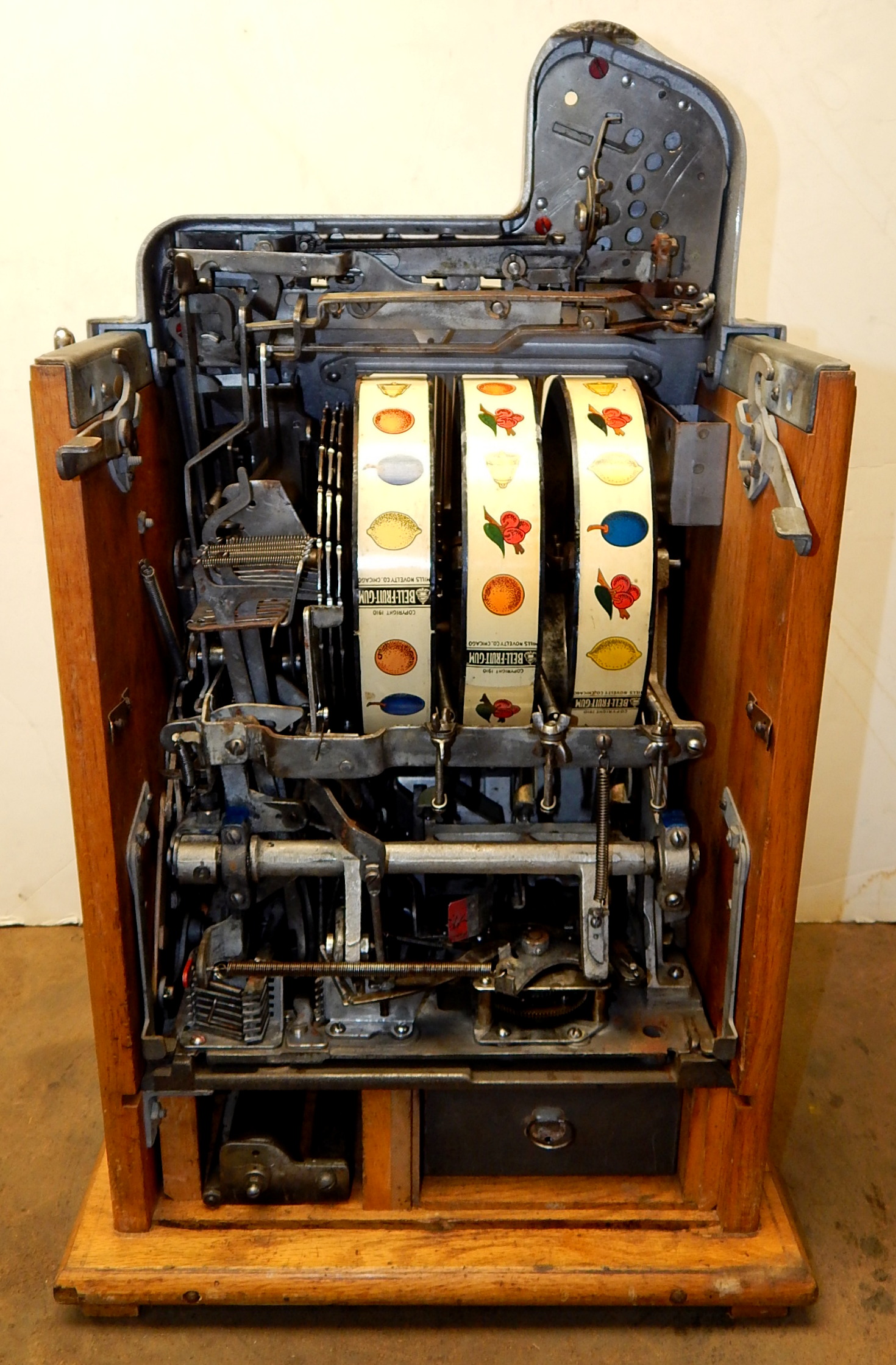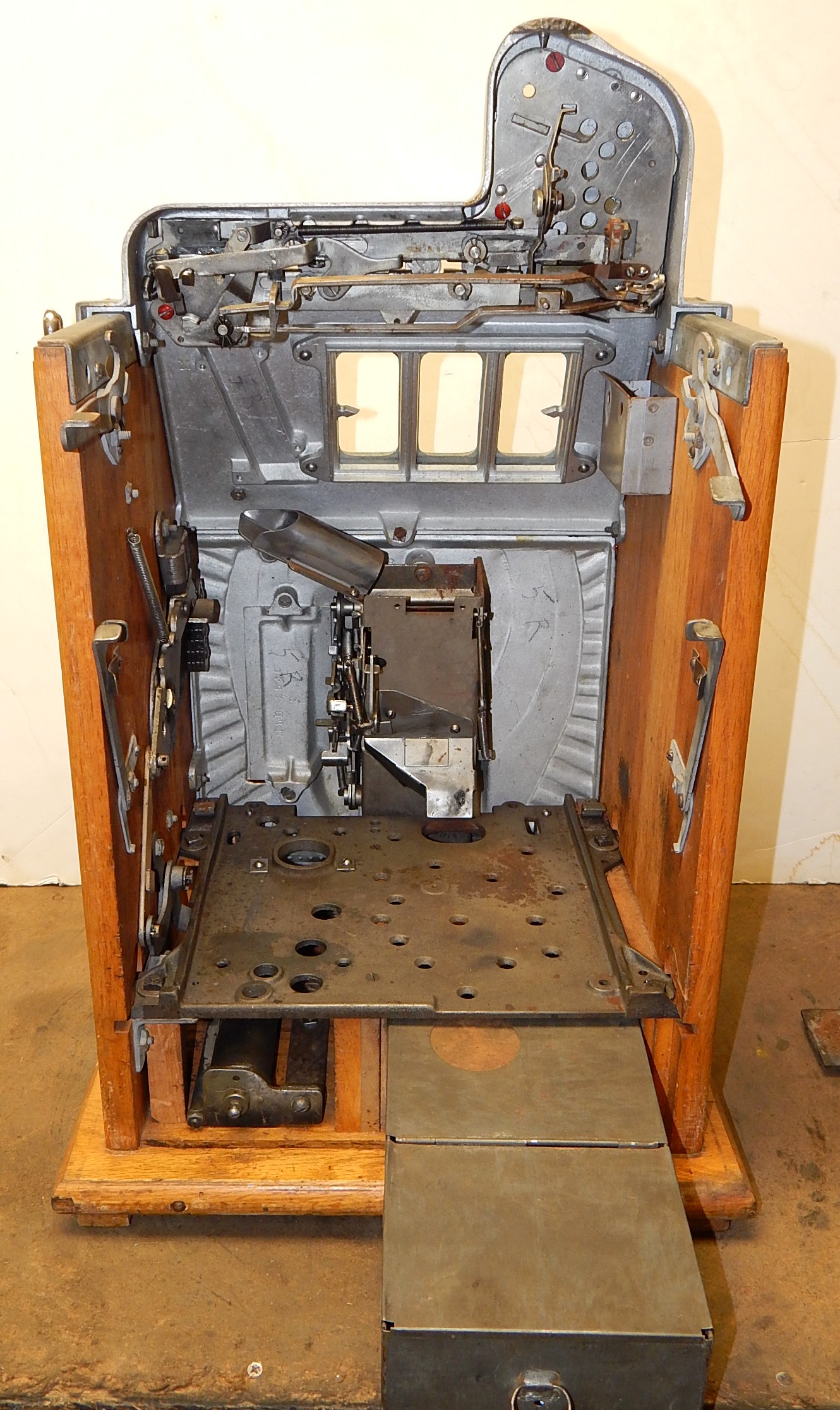 Mills 1926 War Eagle 5 cent, original condition Yellow, Red, Black. Jackpot with reserve, original back door with original Mills back door lock with one key, original cash box. Very nice oak cabinet with Mills decals. If your looking for a nice orignal machine here it is.
