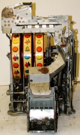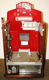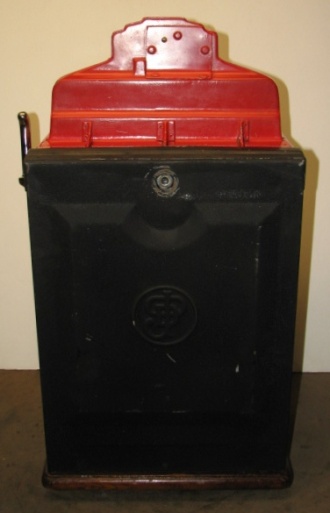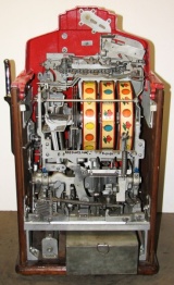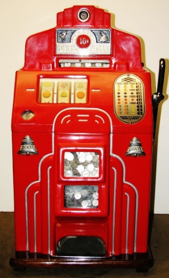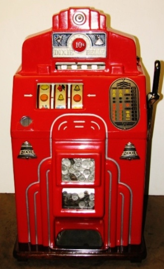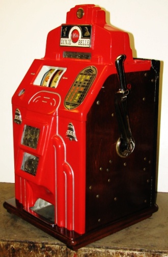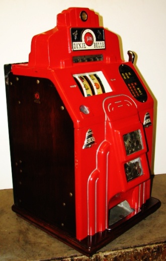 1938 Jennings Dixie Belle Chief, 10 cent. red, trimed in silver, white, and blue. Older restoration, All trim has been nickel plated, cash box, etched award card, original back door with Ace lock, jackpot with reserve, reel stripes changed by the previous owner. Made speciticallt for the southern market. Plays and pays as it should.