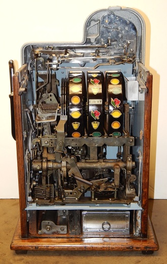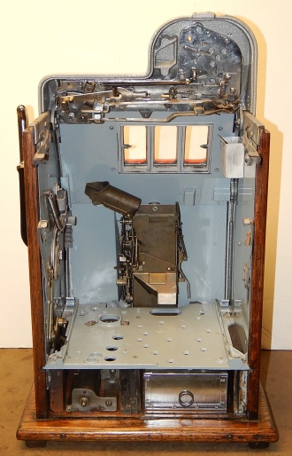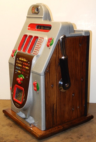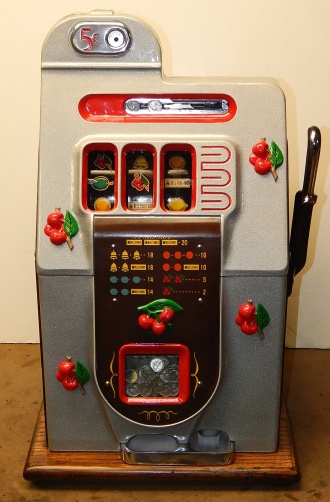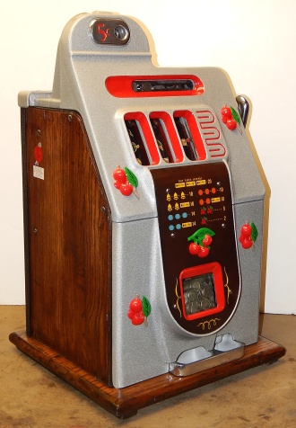 Mills 1947 Black Cherry 5 cent, Silver with red trim. This is a very nice machine restored back to the original colors. Mint condition award card, Jack pot with reserve, original back door and lock with one key, cash box. Plays very easy, pays as it should. 2-5 payout.