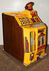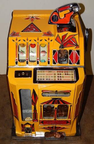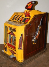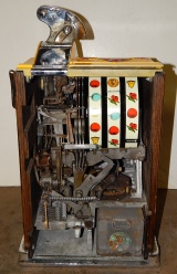1934 Superior Goose Neck Bell, Penny. Gumball Vendor, Gold Award, twin Jackpot. Resorted back to it's original colors trimmed in, yellow, Black, red, orange. Other then the paint, all original.