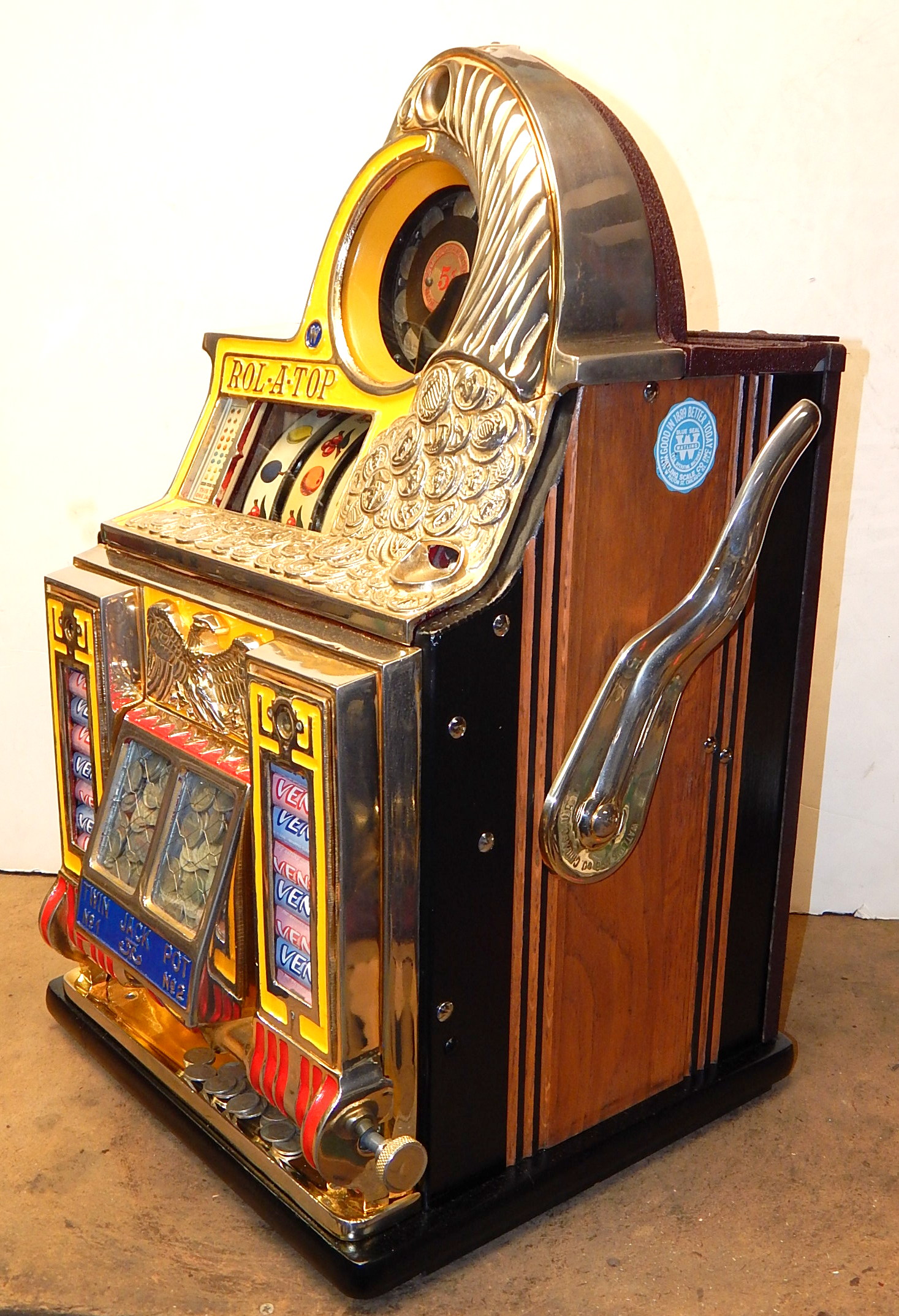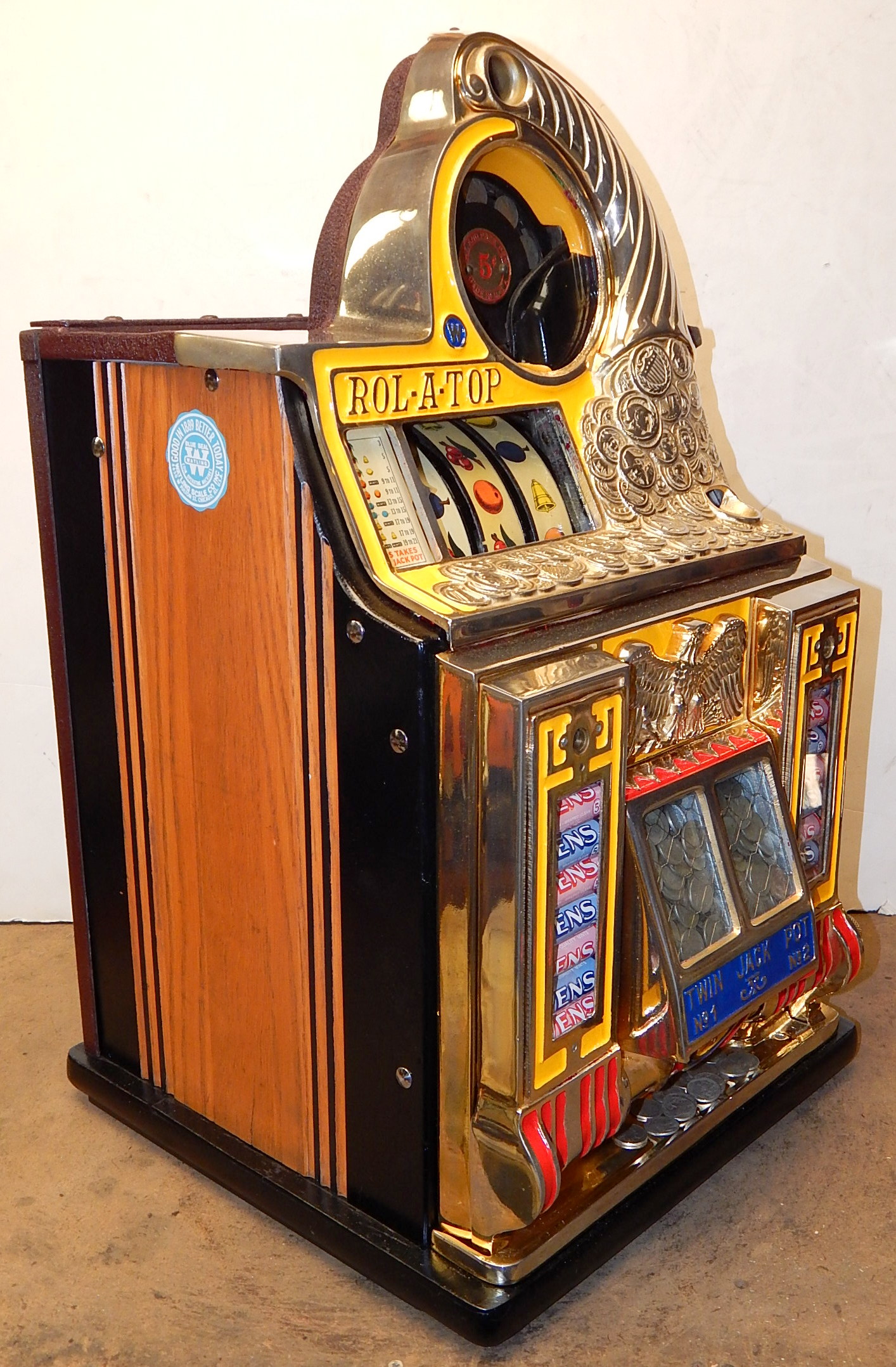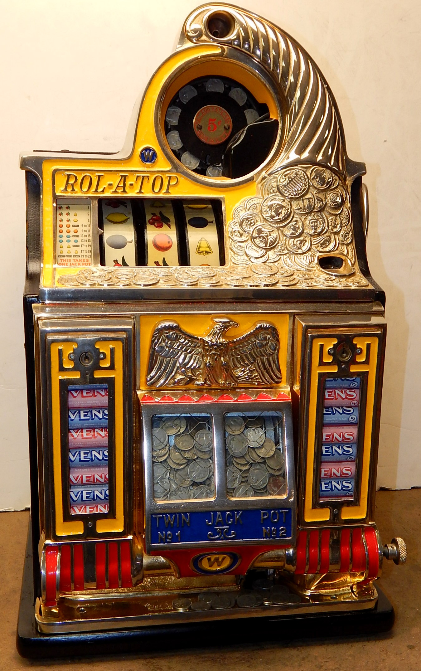 1938 Watling Rolatop "Coin Front" Vendor 5 cent, previously restored back to it original colors, tinted gold coins, trim. Painted Yellow, red and blue. New reel strips, original back door with the original watling lock and key, solid oak cabinet, twin Jackpots, new cash box. You get a roll of mints on every play. Plays easy.