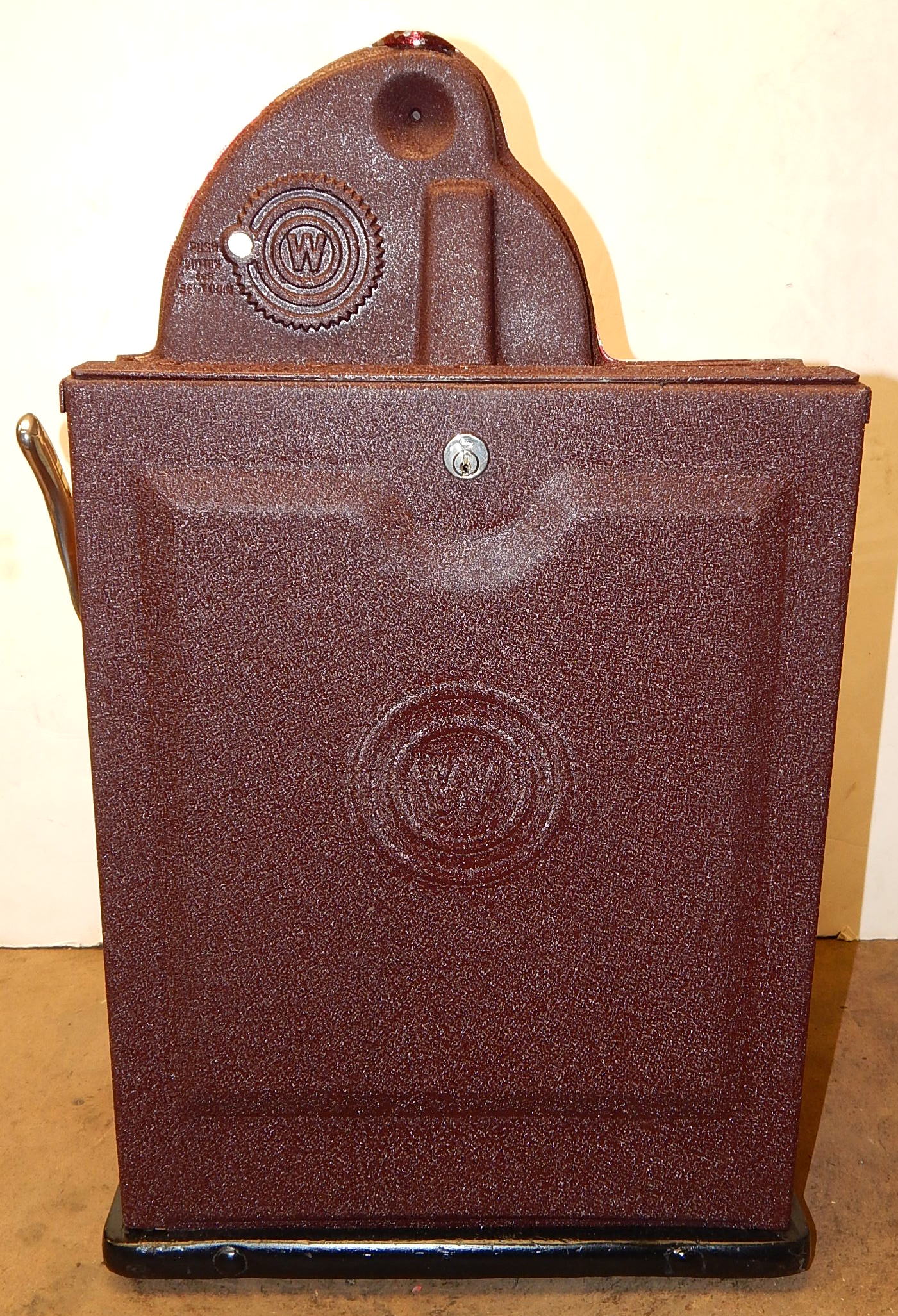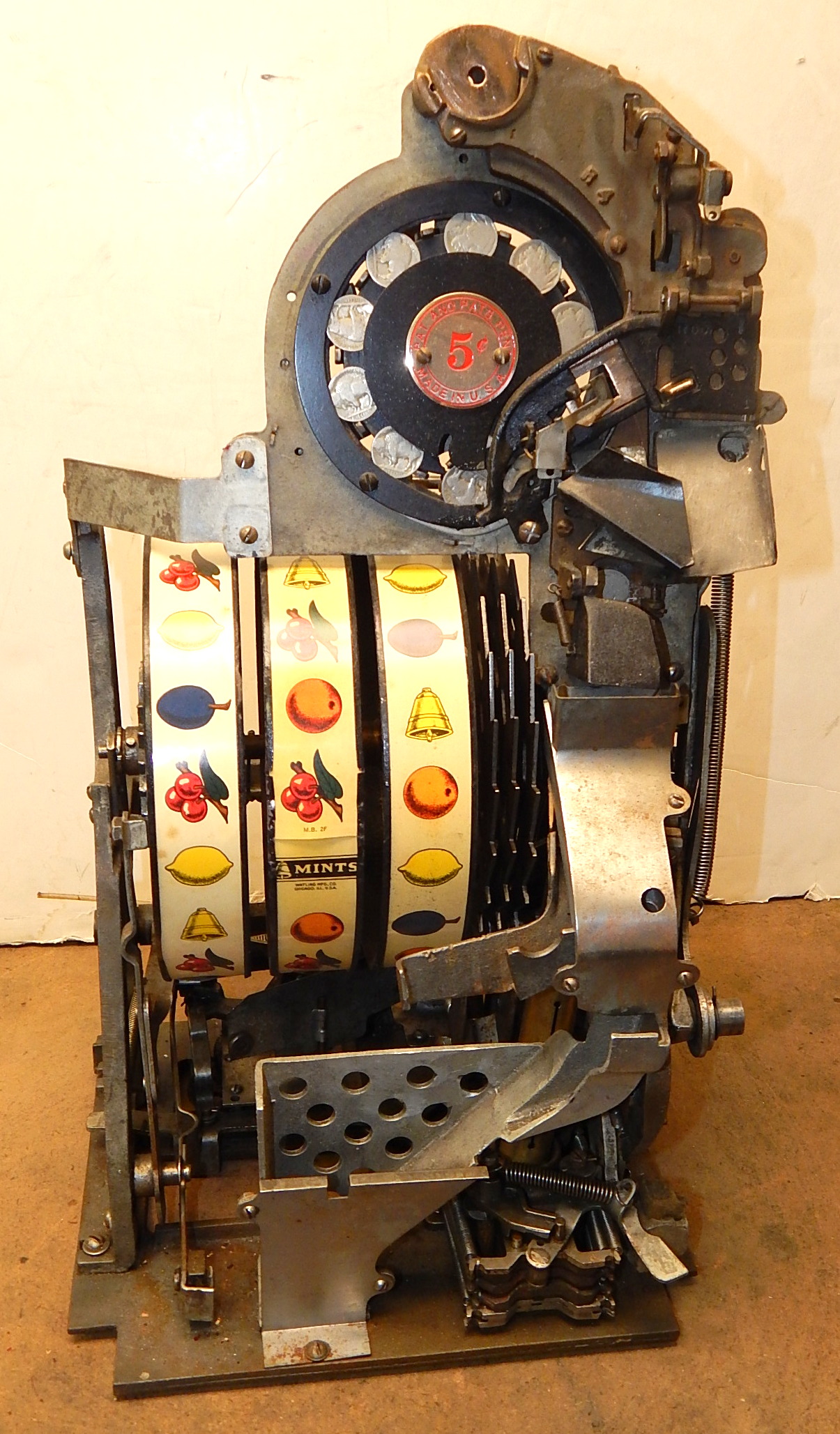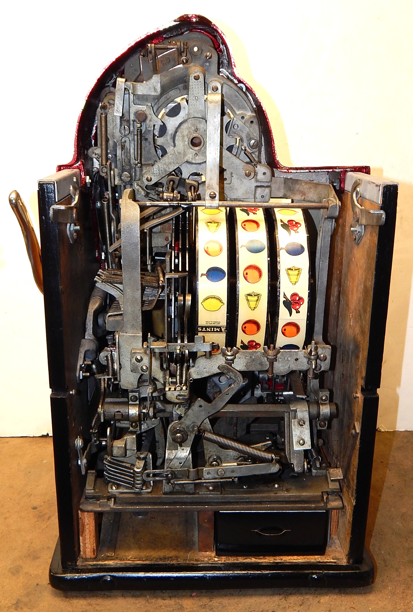 1938 Watling Rolatop "Coin Front" Vendor 5 cent, previously restored back to it original colors, tinted gold coins, trim. Painted Yellow, red and blue. New reel strips, original back door with the original watling lock and key, solid oak cabinet, twin Jackpots, new cash box. You get a roll of mints on every play. Plays easy.