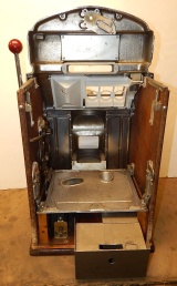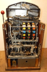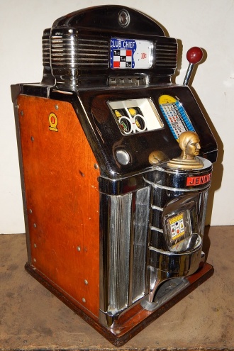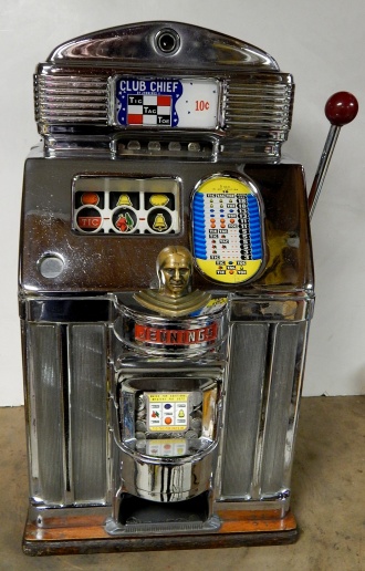 1959 Jennings Club Chief, Tic Tac Toe, 10 cent. Very nice original machine not restored, the original chrome on this machine is 9 out of 10. Has the original cash box, original back door with Ace lock, original reel stripes. If you are looking for a nice all original machine here it is. Tic Tac Toe pays 18 coins. Plays very easy.