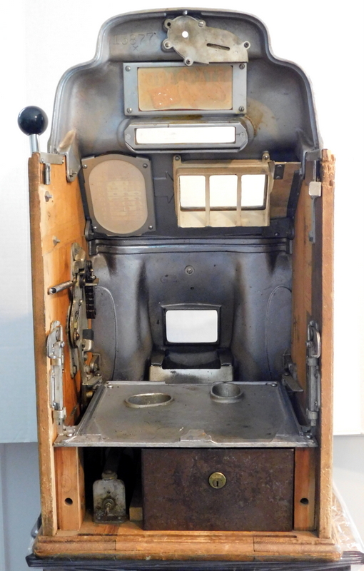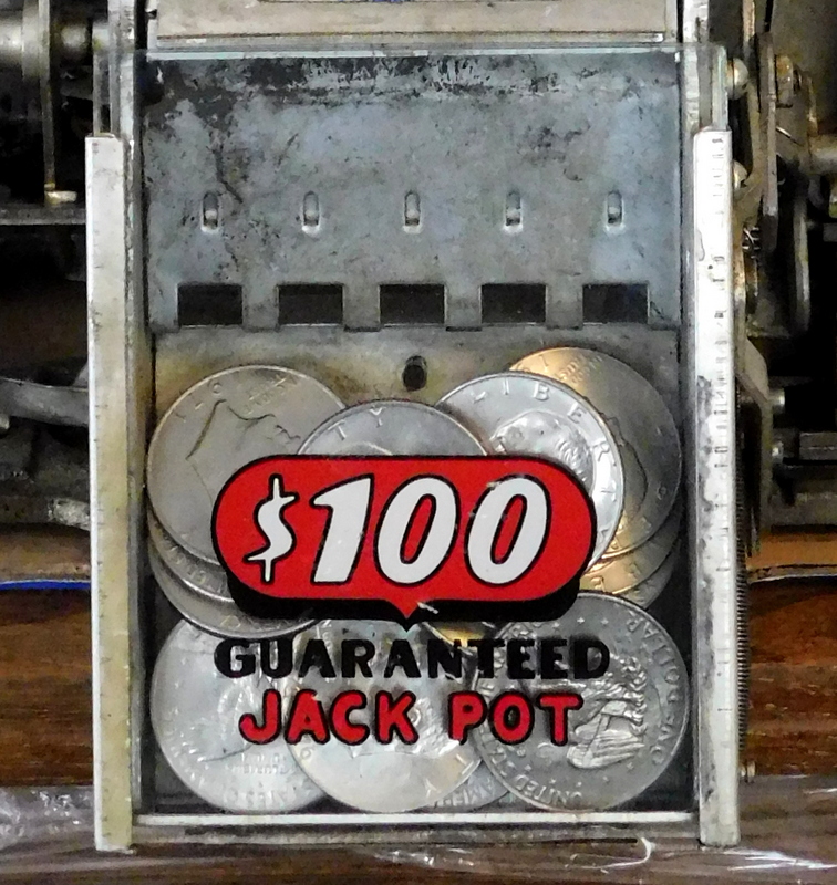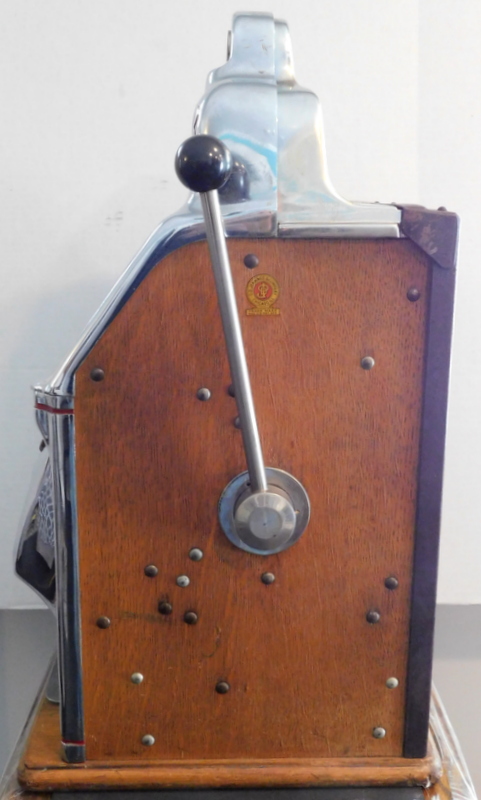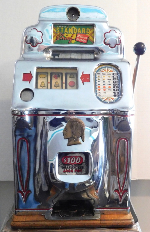 1946 Jennings Standard Chief $1.00, All original the way you want to find them. Serial numbers match. Has a functioning hand load Jack-Pot. Original condition Reel strips. Original Award card and Marquee, original back door with ODJ lock and matching number key, original cash box with ODJ lock and matching number key. Very nice solid oak cabinet. Chrome on this machine is a 8.5 out of a 10, not bad for 80 years old machine. If you are looking for very nice large coin all original then, here it is. They are only original one time the way you want to find them.