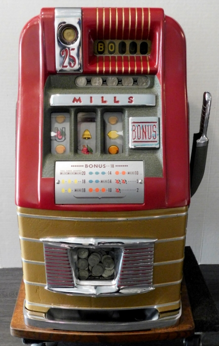 Mills 1948 Bonus Hi-Top 25 cent with the Hard to find Bonus feature. "Older Restoration" restored back to the colors of maroon, Gold, trimed in wrinkle Green. Very nice original oak stained cabinet, jackpot with reserve, new original award card, original cash box, original back door, original Mills lock with one key. The only thing that is not original on this machine is reel strips and paint