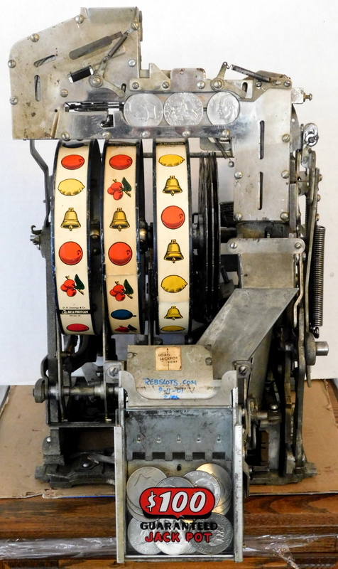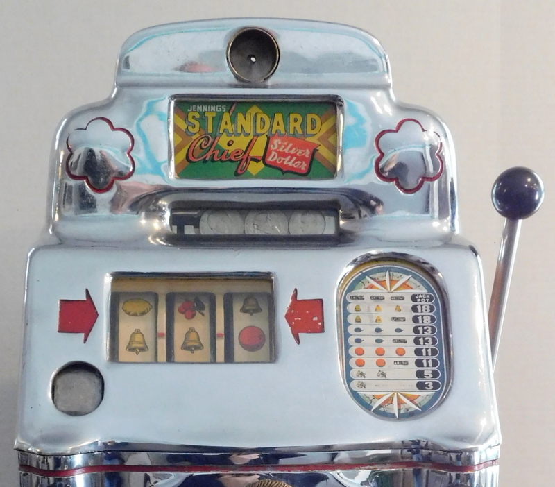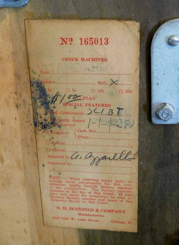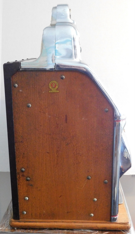 1946 Jennings Standard Chief $1.00, All original the way you want to find them. Serial numbers match. Has a functioning hand load Jack-Pot. Original condition Reel strips. Original Award card and Marquee, original back door with ODJ lock and matching number key, original cash box with ODJ lock and matching number key. Very nice solid oak cabinet. Chrome on this machine is a 8.5 out of a 10, not bad for 80 years old machine. If you are looking for very nice large coin all original then, here it is. They are only original one time the way you want to find them.